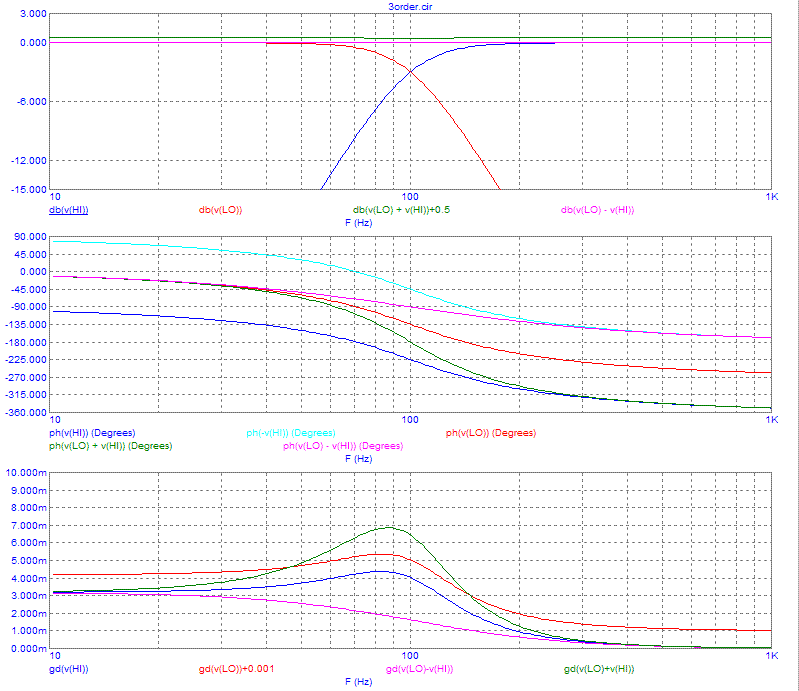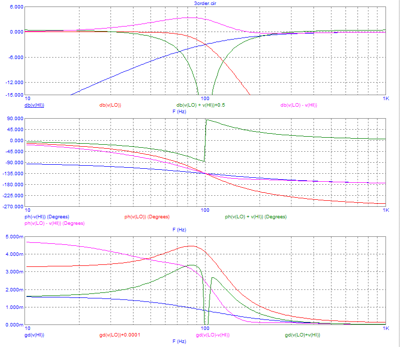 Вначале рассмотрю классический Баттерворта. Ситуация с выходными сигналами фильтров НЧ и ВЧ здесь совсем неоднозначная. Смотрим переходные процессы: Вложение 4292 В этом хитросплетении тяжело разобраться даже намётанному глазу, но всё же попробую. Синяя линия – входной сигнал. Это понятно. Красная линия – сигнал фильтра НЧ. С задержками, опаздывет относительно входного сигнала на 90 градусов как и положено НЧ. Это тоже понятно. Зелёная линия – сигнал фильтра ВЧ. Отрабатывает только фронт импульса и опережает входной сигнал на 90 градусов. Тоже разобрались. Амплитуда выходных сигналов фильтров в 0,707 раза ( на 3дБ) меньше входного. А теперь попробуйте объединить эти три линии в один график: Вложение 4294 Не напоминает ли этот рисунок сигналы трёхфазной линии передачи в электротехнике? Очень даже, только там сдвиг фаз немного другой. А из курса электротехники известно, что порядок чередования фаз определяет направление вращения электромотора. У нас похожая ситуация. Вернёмся к первому рисунку. Чёрная линия – результат суммирования сигналов фильтров НЧ и ВЧ. Целый период идёт установление переходного процесса и, хотя в конце мы получаем амплитуду сигнала равную входному сигналу, такое поведение нельзя назвать идеальным. Выходной сигнал противофазен входному. А что будет, если мы вопреки теории инвертируем сигнал ВЧ? Это демонстрирует фиолетовая линия. Тут переходной процесс заканчивается уже на первом полупериоде, и фаза выходного сигнала гораздо ближе к входному. А что нам покажут частотные графики? Вложение 4293 Здесь тоже немало линий, но разобраться гораздо легче. Здесь графики обозначены: Красный – фильтр НЧ, Синий – фильтр ВЧ, зелёный – сумма сигналов НЧ и ВЧ, фиолетовый – сумма сигнала НЧ и инвертированного ВЧ. На верхнем графике АЧХ видно, что сумма и разность выходных сигналов имеют одинаковую амплитуду во всём диапазоне. Но на среднем графике ФЧХ видна большая разница между поведением фазы суммарного и разностного сигналов. Зелёный график изгибается гораздо круче, а фиолетовый намного ровнее. Это значит, что при инвертировании сигнала фильтра ВЧ мы получаем гораздо более фазово-сведённую систему. Для наглядности голубым нарисована ФЧХ инвертированного сигнала ВЧ. Наглядно это видно на нижнем графике ГВЗ. Здесь красная линия приподнята на 1 мс, иначе она полностью повторяет синюю. Сразу бросается в глаза горб задержки на зелёном графике суммарного сигнала. А разностный (фиолетовая кривая) совсем даже не кривая, а аудиофильская наклонная линия. Вывод номер четыре: Первое: Фильтр Баттерворта третьего порядка работает корректно. Второе: лучше инвертировать сигнал фильтра ВЧ. Третье: сигналы на выходах НЧ и ВЧ не совпадают по времени, хотя фильтр согласован по фазе. Теперь проверим хвалёного Бесселя третьего порядка на профпригодность. Вот реакция на входной сигнал: Вложение 4295 Цвета линий те же, что и в предыдущем случае. Сумма сигналов фильтров НЧ иВЧ даёт нам ослабленный (!) сигнал в противофазе с входным, а разность – сигнал в 1,41 раза больший по амплитуде, чем входной сигнал. Частотные графики также не радуют: Вложение 4296 Получается либо горб АЧХ, либо провал АЧХ, а графики ГВЗ петляют, «як тот бик по череді... ». Вывод номер пять: Фильтр Бесселя третьего порядка в звуке неприменим. |