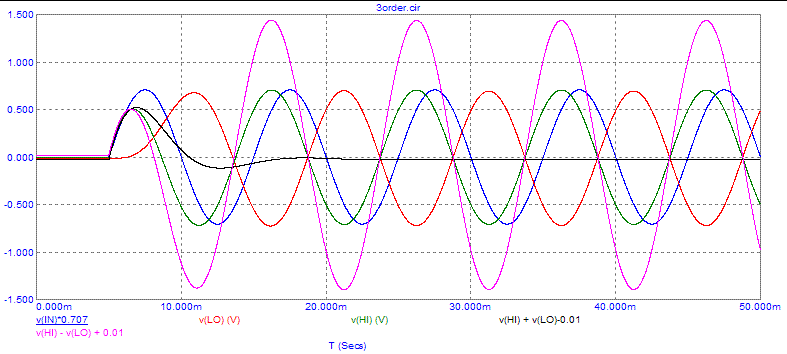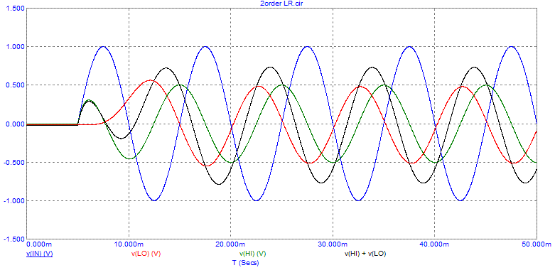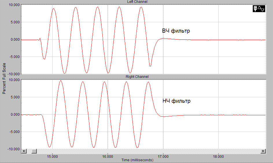 Посмотрите на временные сигналы на выходе фильтров НЧ и ВЧ на частоте раздела 2530Гц: