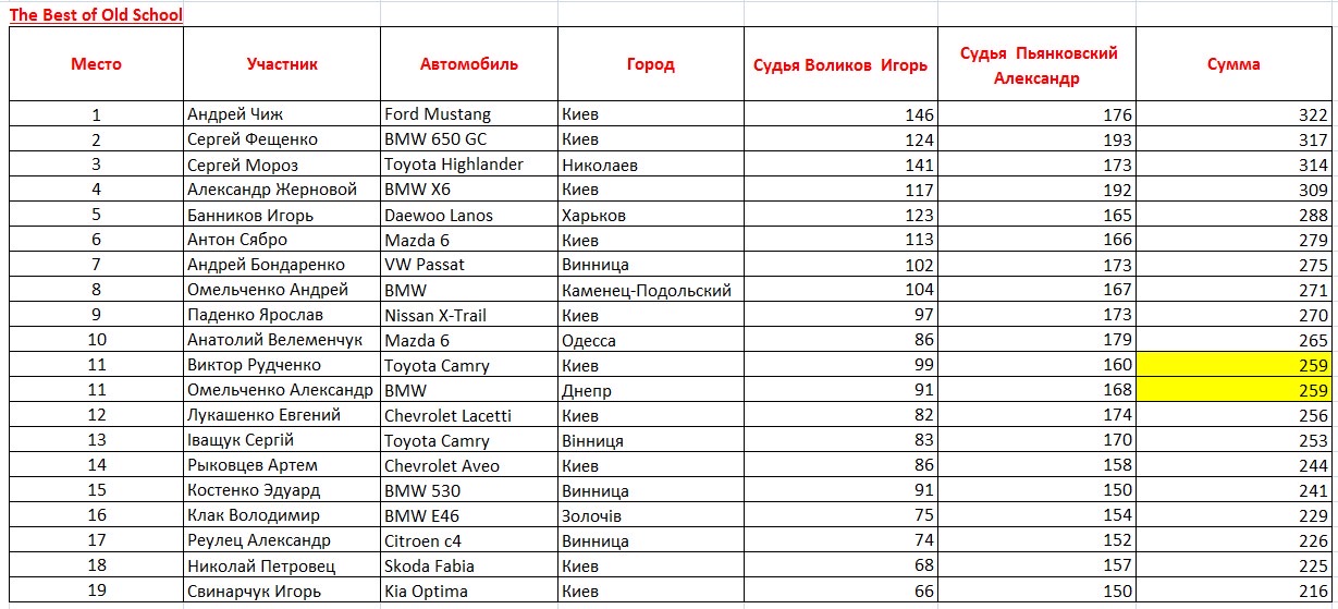 Обновлено на 10 июля!!! Класс до 5000 Евро: Анатолий Велеменчук, Mazda 6, Одесса Паденко Ярослав, Nissan X-Trail, Киев Рыковцев Артем, Chevrolet Aveo, Киев Антон Сябро, Mazda 6, Киев Клак Володимир, BMW E46, Золочiв Сергей Мороз, Toyota Highlander, Николаев Костенко Эдуард, BMW 530, Винница Дмитрий Семенов, Mazda CX-5, Житомир Омельченко Андрей, BMW, Каменец-Подольский Реулец Александр, Citroen c4, Винница Виктор Рудченко, Toyota Camry, Киев Лукашенко Евгений, Chevrolet Lacetti, Киев Іващук Сергій, Toyota Camry, Вінниця Омельченко Александр, BMW, Днепр Шалаев Павел, Kia Sportage, Киев Класс Unlimited: Сергей Фещенко, BMW 650 GC, Киев Андрей Чиж, Ford Mustang, Киев Александр Жерновой, BMW X6, Киев Андрей Бондаренко , VW Passat, Винница Руслан Кореновский, Toyota Highlander, Житомир |