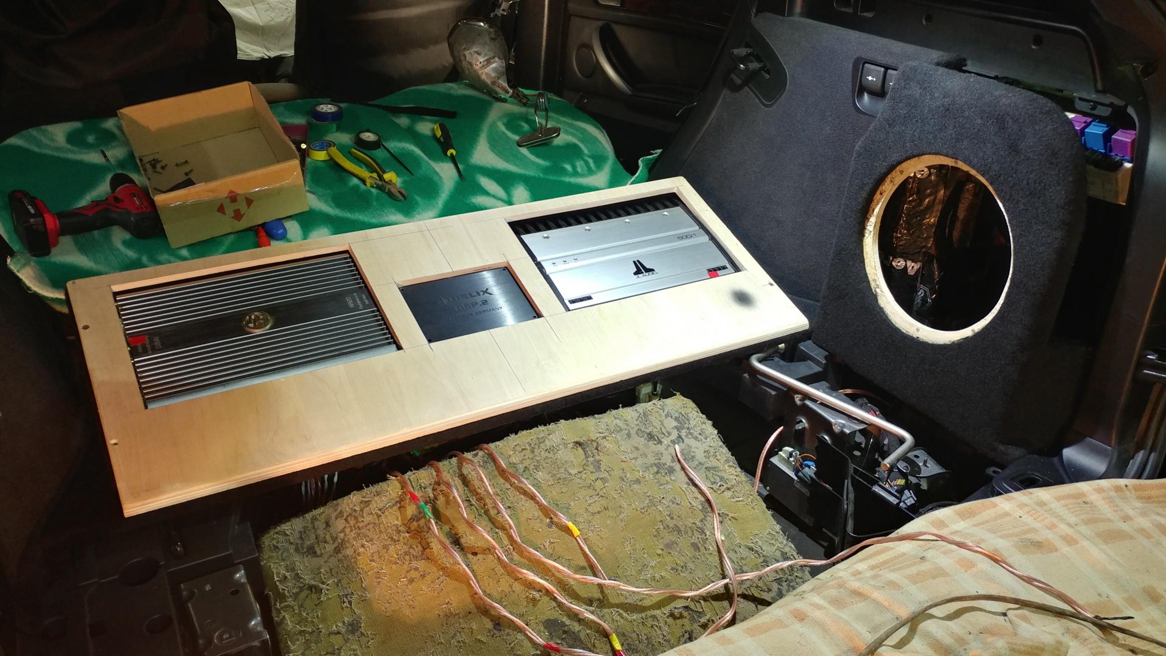 Обтянутый карпетом саб смотрится ОЧЕНЬ симпатично в салоне. Хорошо вписывается в дизайн багажника и аппаратный блок. Сигнал со штатной головы подается на входы высокого уровня процессора, т.е. все что играло штатно в авто будет воспроизводится в достаточно хорошем качестве через установленную аудиосистему.