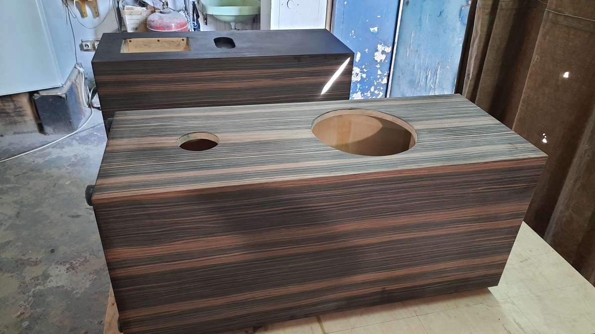 Отделка 2х цветный итальянский шпон и датское масло. С тыльной стороны НЧ бокса сделано углубление для размещения кроссовера НЧ ( или по желанию заказчика усилителя D-Class ).