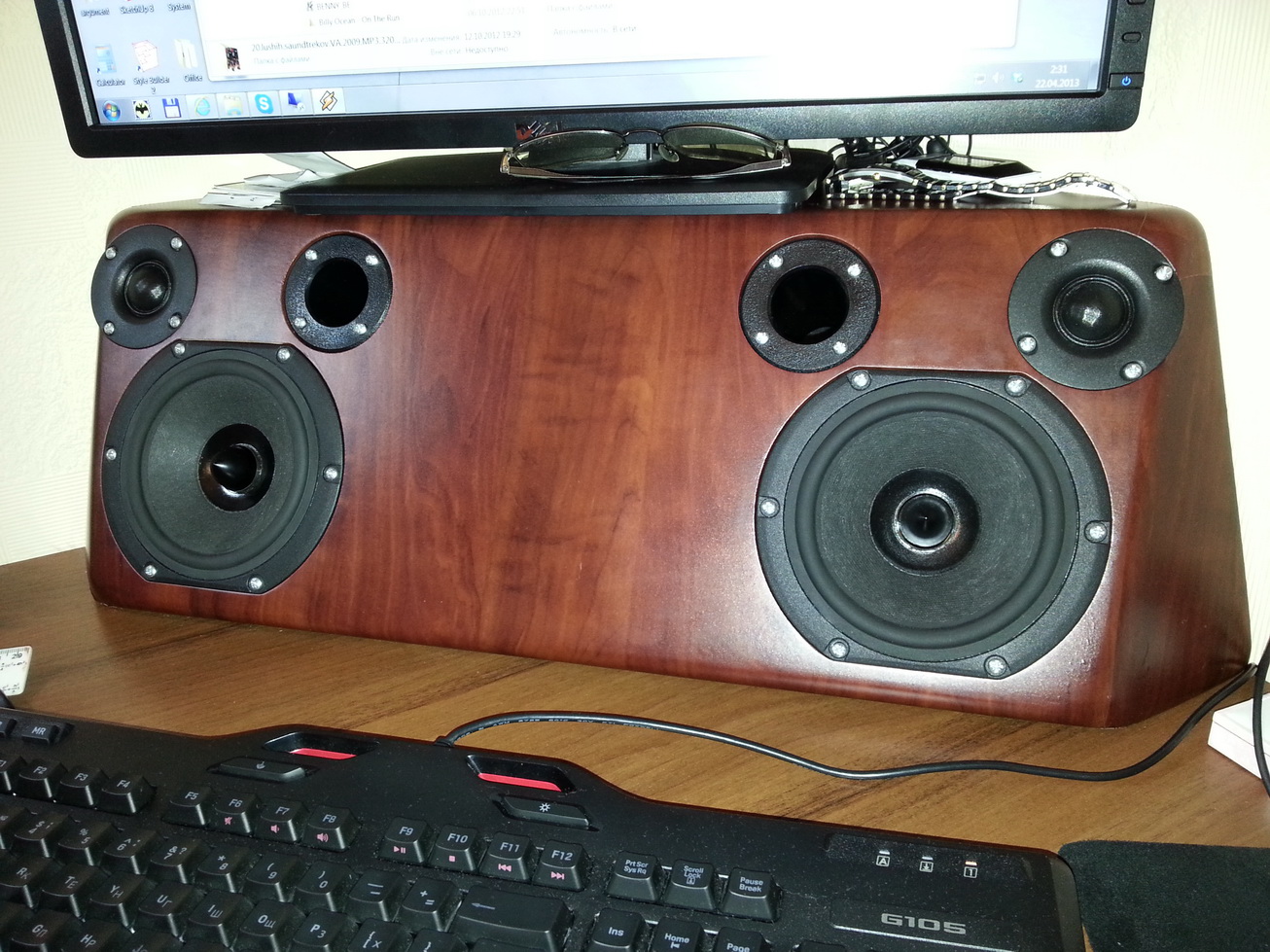 Отлично изготовления система! И выглядит дорого. Но не слишком ли узковата стереобаза? Может быть с этой целью лучше изготовить две отдельные колонки? Тогда и ногу монитора менять не пришлось бы... Если я правильно понял, система установлена дома. Попрошу-ка одного нашего одноклубника выставить свою домашнюю/ компьютерную систему, которая звучит просто шикарно да и выглядит необычно