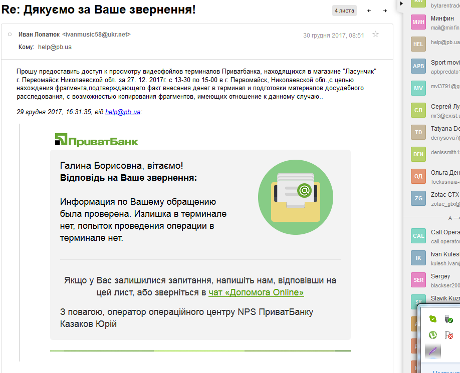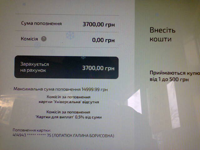 и службы безопасности ПриватБанка Лопатюк Галина Борисовна г. Первомайск, Николаевская обл. +38 098 798 3803 ivanmusic58@ukr.net 27.12.2017г., около 14 ч. 30 мин., терминал Приват Банка в магазине «Везунчик» ул. Коротченко 1, г. Первомайск Николаевская обл. принял вносимые моим мужем Лопатюк Иваном Владимировичем наличные в сумме 3700 грн. (три тысячи семьсот грн.), но не перевел их на мою приват карточку — завис (не нажималась кнопочка-транспорант «Перевести»). Проводимые действия на терминале: - пополнить карточку – вставить карточку (получил ее назад) - внесение купюр (при этом на дисплее высветились мои ФИО – Лопатюк Галина Борисовна, группы цифр номера карточки, с внесением денег увеличивалась отображаемая сумма внесенных денег.) Муж довольно длительное время вносил деньги (значительная сумма, да еще некоторые купюры сначала не принимались, а потом были приняты терминалом), - затем многократно, и без должного результата, нажимал зависшую кнопку «Перевести», - многократно нажимал кнопку «Так» на дисплее, в ответ на вопрос терминала «Вы еще здесь?» Таким образом ТСО работал в штатном режиме, не удавалось только перевести внесенную сумму. - подходили свидетели, смотрели на сумму перевода. Муж отходил от терминала на несколько десятков секунд, спрашивал у продавцов магазина «Ласунчик», что делать, куда звонить-кого вызывать, на что те ответили, что подобное здесь часто случается, № 3700 назвали мгновенно, возвратился и продолжал сохранять информацию на табло ТСО. - так же делал фото дисплея зависшего ТСО, под разными углами обзора, что бы были видны отражения и отблики от внешней обстановки (см. фото), - несколько раз дозванивался на «Горячую линию» № 3700 не отходя от ТСО, - в разговоре с оператором 3700 (не отходя от ТСО) указывал, что не хочет отходить от терминала, так как на дисплее сохранилась вся информация о неудавшемся пополнении приваткарточки на сумму 3700 грн., на что оператор горячей линии ПриватБанка 3700 ответил, что мой муж уже длительное время стоит перед ТСО, длительное время нажимает кнопку «так» в ответ на запрос «Вы еще здесь?», пытаясь сохранить информацию о неудачном пополнении карточки. Оператор гарячей линии Приватбанка 3700 настоял на передаче трубки мне, как оказалось всего лишь для моей идентификации, а не для помощи в разрешении ситуации (я в это время находилась в автомобиле, рядом с магазином «Ласунчик»). Своими действиями оператор 3700 создал у нас уверенность, что ситуация под контролем, он все видит, и проблем с возвратом денег не будет. Каковы же были наше удивление, гнев! когда через сутки нам пришла СМС с отказом в возврате денег: "Излишка в терминале нет, попыток проведения операции в терминале нет." Это ваши специалисты провели проверку терминала, даже НЕ УТОЧНИВ № ТСО и в каком именно магазине «Везунчик» в г. Первомайск он установлен! Если же терминал определен посредством технического мониторинга, значит подтвержден факт приема ТСО денег и некорректной его работы! Нас что – за дураков принимают? Вы еще скажите, что случившееся - это сон, нам приснилось!… Таким образом получается, что - некоторые ТСО «ПриватБанка» внешне – в исправном и рабочем состоянии - на самом деле могут быть или неисправными, или преднамеренно настроены только на прием денег, без перевода денег на карточки клиентов, - некоторые операторы «гарячих линий ПриватБанка»