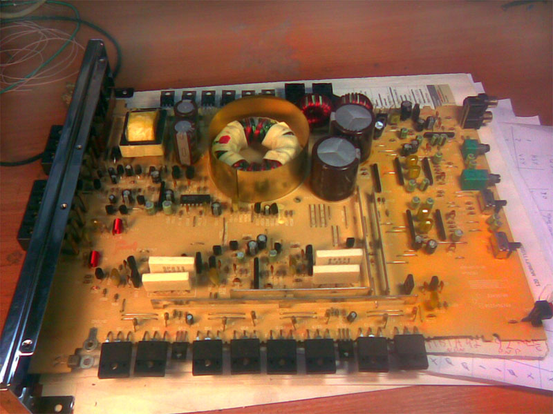 Что мы видим. Сразу же бросается в глаза просто огромный сердечник импульсного блока питания. Да, по железу здесь есть запас мощности. Большие банки конденсаторов питания 3300мкф 50В, сдвоенные выходные транзисторы 2SC2987-2SA1227 в правильном корпусе TO-3 и строенные ключи преобразователя дают надежду на хорошие мощностные параметры. Питание выходных каскадов +-37вольт, значит на выходе два по 100 Вт. Ну что, пациент, приходите на обследование…