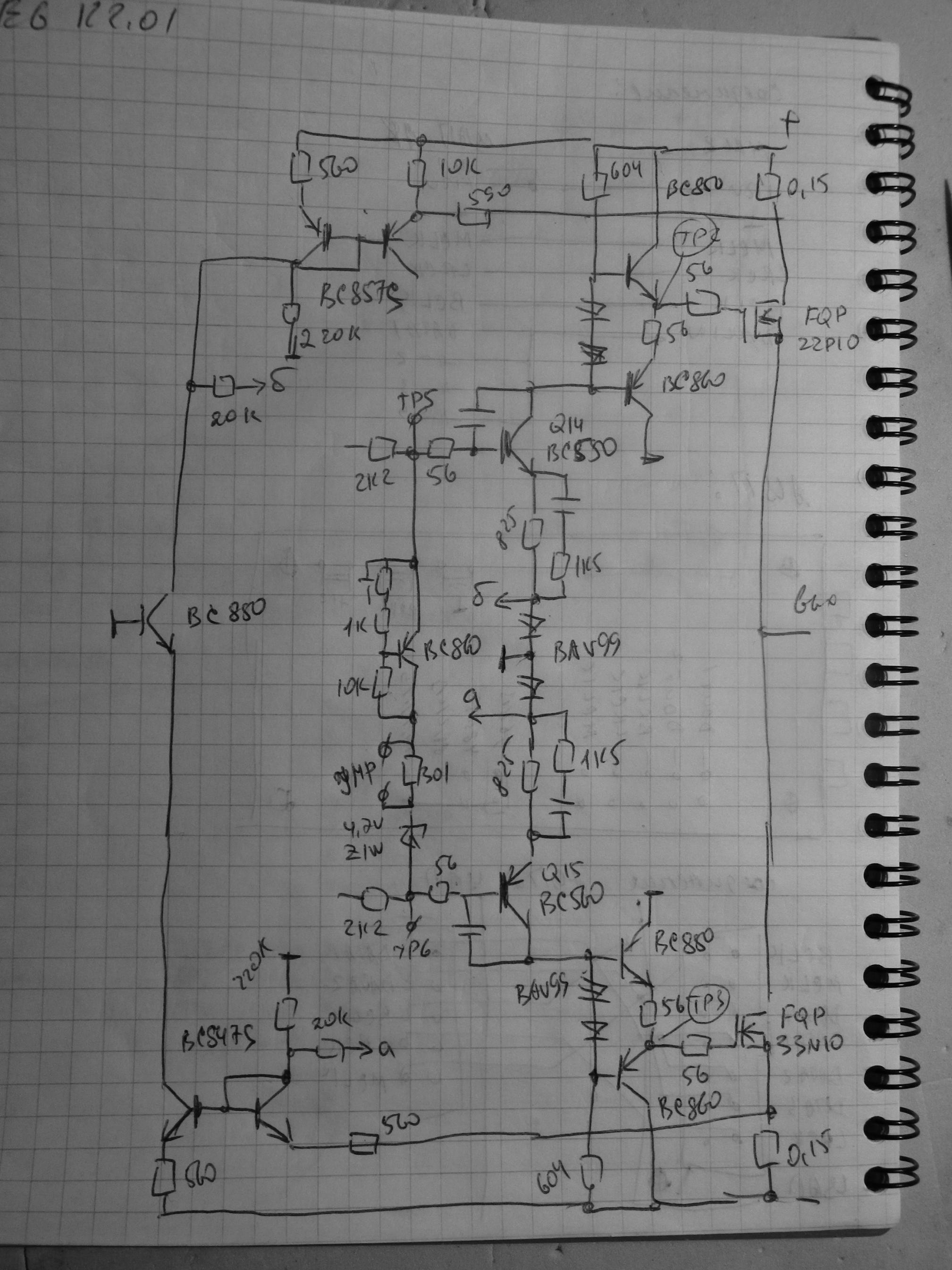 Есть у меня два аппарата, K2.01 и K2.04. В обоих проблема с постоянкой на выходе. Выходные транзисторы в норме. Проблема локализации неисправности усугубляется срабатыванием защиты и мелким монтажом. Второй вопрос почти победил - провёл выходные с микроскопом и нарисовал часть схемы выходного усилителя (без платы УН): Если у кого есть наработки, прошу поделиться! |