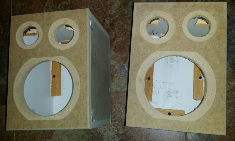 Корпуса внутпи проклеены шумкой (сырая резина с фольгой) сверху неё паролон рефлёный. Передние и задние стенки проклеены жидкие гвозди и через бруски прикручены на 4 самореза каждая. Кросоверы закреплены на боковых стенках при помощи 2х саморезов каждый, а так как они прижаты к паролону нет ни каких шансов на призвуки. Кабели от самих драйверов минимальны около 10 см. Колонки асиметричны на правой твитер справа а на левой слева (если что можно поменять). Ну и пару фото промежуточного процесса .... |