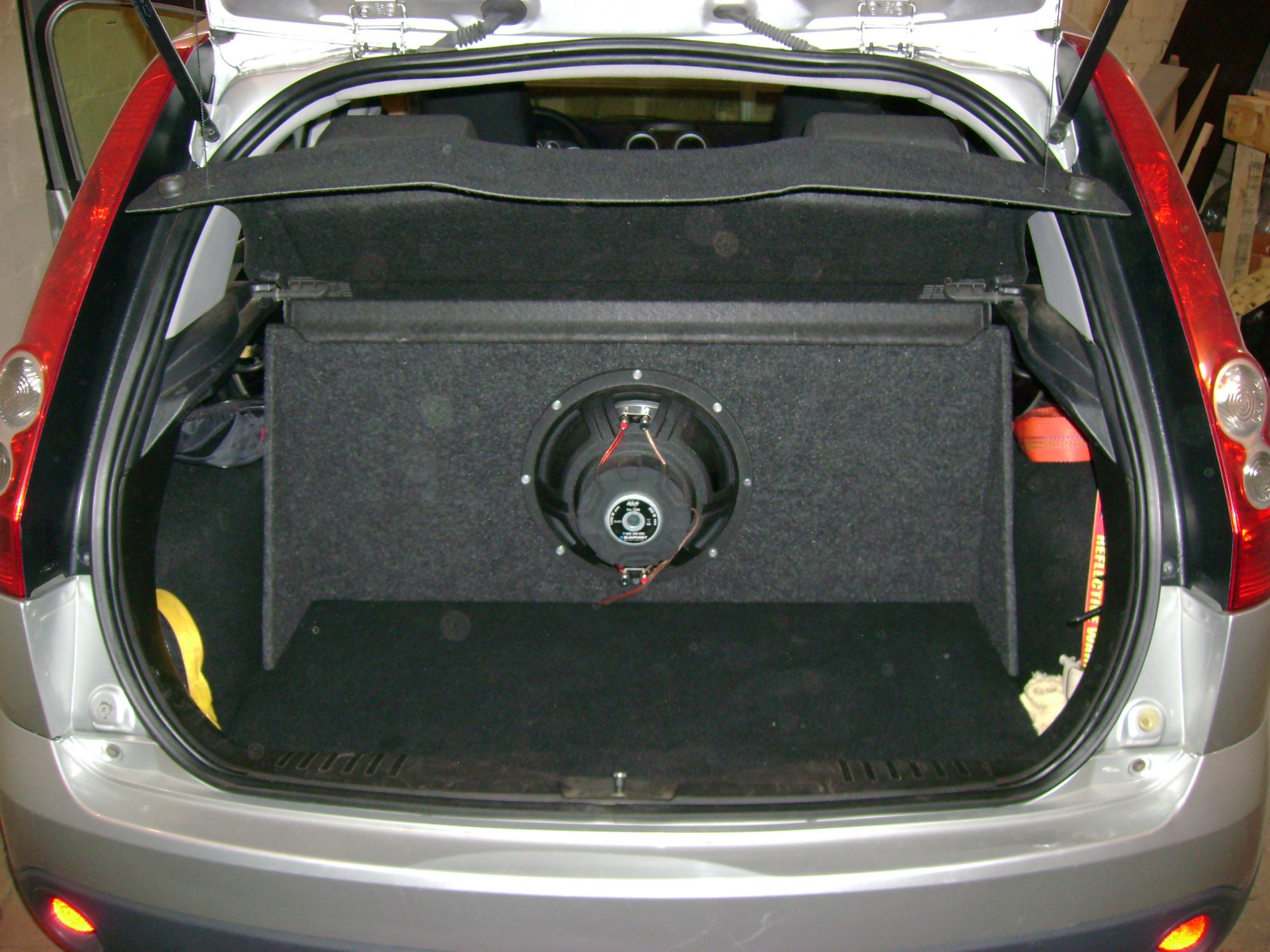 У меня когда-то была Фиеста мк6. Стояла 10" корзиной наружу. Ящик ставился и снимался при сложенных задних сиденьях через любую заднюю дверь. Через проем багажника было почти нереально.