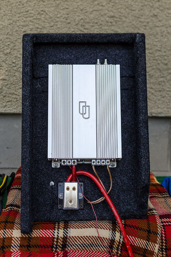 Підсилувачі розміщені сендвічем один над одним на задній стінці ящика сабвуфера.
