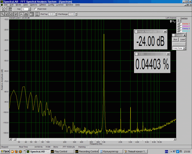 Вот где мы итальянцев проверим! Подключил блок питания 13В, генератор, осциллограф, милливольтметр и анализатор спектра. Генератор и анализатор спектра в сумме имеют искажения 0,005% и динамический диапазон 95дБ, что достаточно для проверки этого усилителя. Вообще приятно возиться с классной вещью вечером под музыку Гарри Мура! Подбираю ток покоя по минимуму искажений синуса 1 кГц и выходной мощности 1 и 10 Вт. Оказалось, есть явно выраженный оптимум тока покоя выходных транзисторов. Если меньше – лезет забор 5-10 гармоник, если больше – вылазит 3-я гармоника. Оказалось оптимум около 18мА на транзистор. При этом Кг=0,04% на 1 Вт и 0,02% на 10Вт. Хорошо. |