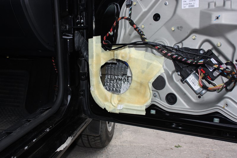 Вырезал в металле отверстие под мидбасс. Радиус окружности практически накладывается на рейку стеклоподъемника, поэтому в процессе нужно быть внимательным, чтобы ее не порезать.