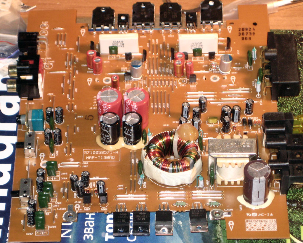 Вот дом, который построил Джек… Лежит передо мной усилитель Alpine MRP-T130, который не играет. - Звуковой сигнал заходит через входной разъём и умирает на двух электролитах. Убираю электролиты. Лучшие электролиты – перемычки. - Звуковой сигнал заходит через входной разъём, проходит бывшие конденсаторы, и умирает на двух операционниках 4558. Заменяю операционники на более хорошие NE5532 – 4 штуки. - Звуковой сигнал заходит через входной разъём, проходит бывшие конденсаторы, пробирается через операционники, и умирает на двух электролитах на входе усилителя мощности и ключе «Мюта» Первый конденсатор заменяю на качественную перемычку, а второй – на низкоимпедансный Hitano. Также заменяю конденсатор обратной связи на полимерный электролит. Он «играет». - Звуковой сигнал заходит через входной разъём, проходит бывшие конденсаторы, пробирается через операционники, переползает через электролит, входит в усилитель мощности, и умирает на драйверном каскаде с малым током (5мА). Я изменяю режим генератора тока и усилительного каскада, чтобы они корректно работали с током 10 мА и раскачивали выходные каскады. - Звуковой сигнал заходит через входной разъём, проходит бывшие конденсаторы, пробирается через операционники, переползает через электролит, входит в усилитель мощности, проходит драйверный каскад, и умирает на предвыходном каскаде, где между эмиттерами предвыходных транзисторов стоит большое сопротивление (220 Ом), шунтированное электролитом. Ток покоя предвыходных каскадов всего 5 мА! J Выпаиваю конденсатор и заменяю сопротивление между эмиттерами предвыходных каскадов с 220 на 75 Ом. - Звуковой сигнал заходит через входной разъём, проходит бывшие конденсаторы, пробирается через операционники, переползает через электролит, входит в усилитель мощности, проходит драйверный каскад, проходит первые эмиттерные повторители, и умирает на выходном каскаде с током покоя чуть больше нуля. Регулирую ток покоя до 200 мА. Усилитель теперь греется, как печка. Я это знал и предусмотрел целую цепочку мероприятий. - Звуковой сигнал заходит через входной разъём, проходит бывшие конденсаторы, пробирается через операционники, переползает через электролит, входит в усилитель мощности, проходит драйверный каскад, проходит первые эмиттерные повторители, выходные транзисторы - и умирает на слабом питании всей системы. Частота преобразования 21 кГц меня просто удивила. Нестабилизированное питание, отсутствие шунтирующих конденсаторов операционников тоже нехорошо влияет на звук. Повысил частоту преобразования до 30 кГц, добавил пять деталей для получения стабилизированного выходного напряжения, понизил напряжение питания с +-25 Вольт до +-19,5 Вольт для уменьшения нагрева усилителя. Для такого напряжения пересчитал стабилизаторы +-15 Вольт питания операционников, зашунтировал шины питания операционников плёнкой, добавил конденсаторов по питанию выходного каскада усилителя. Естественно всё это делается не наобум, а после прорисовки схемы усилителя и моделирования в Микрокапе. Ток покоя усилителя теперь 2,5 ампера по 12 вольтовому питанию, но выходное напряжение преобразователя стоит неподвижно при изменении питания от 10,8 до 18 вольт. Усилитель греется, но терпимо. Приятно было поработать с SMD деталями типоразмером 0603 (1,6 на 0,8 миллиметра) J А звук что, дошёл до динамика