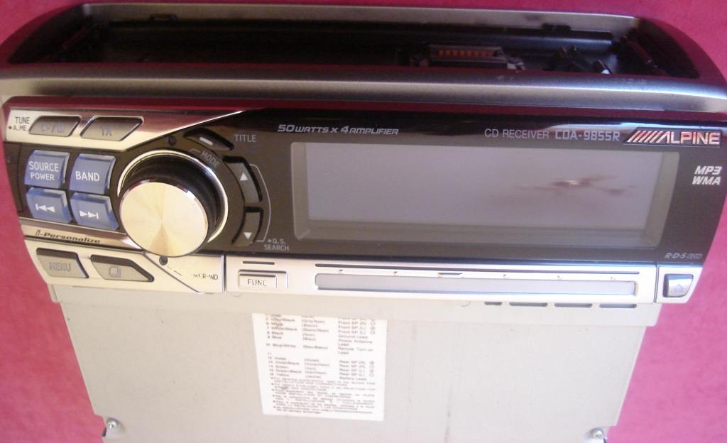 Alpine CDA-9855R, в хорошем состоянии,полный комплект: голова, шахта, рамка,разьем, футляр, пульт, инструкция, немного затерта кнопка FUNC и надпись Power , остальные кнопки не затертые, работает без проблем, диски читает нормально, панель работает нормально.