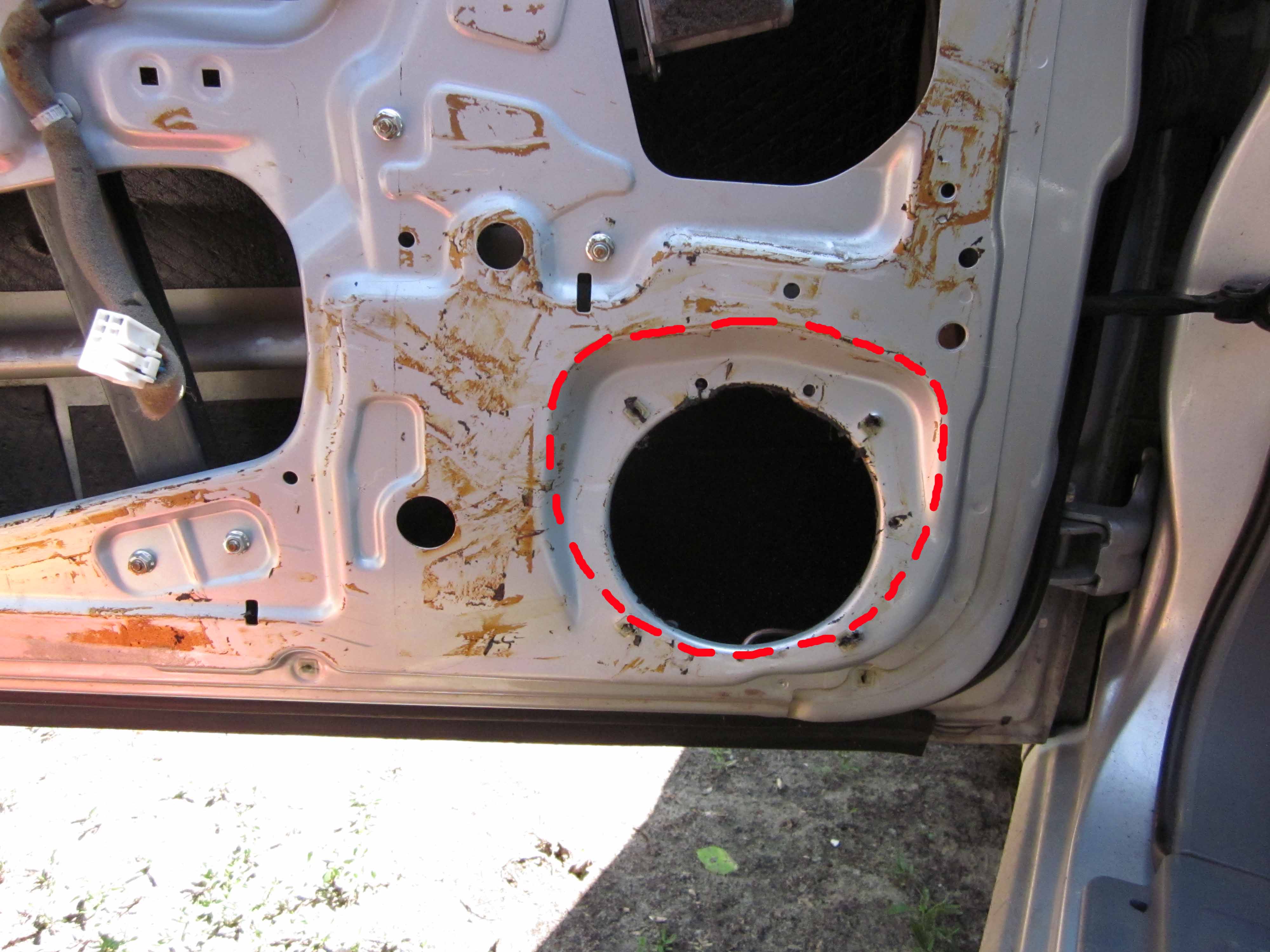 Подики под ВЧ готовы и ждуть перетяжки... Далее миды, тут интереснее, карты дверей Лачика созданы для того чтоб искоренять серединку впринципе))) на фотке видно, какой по сути должна быть сеточка и какой она является на самом деле, посему сетку долой, а на ее место уже человеческий подик. Далее тонель, в Лачике как и в многих других автомобилях он тут как тут, что опять-же плохо для той-же середины, выйти из ситуевины поможет балгарка(или лобзик) без них никак(на фото красным отмечена примерная линия обреза).
