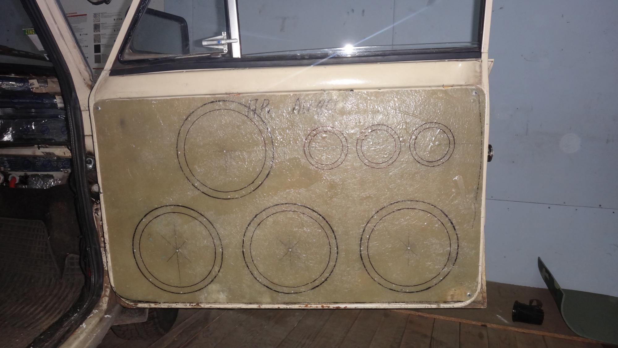 Хух поехали. Акустика, то есть динамики ( вуфера ) подбирались, под дверной объем, по предварительным ращетам приблизительно 40 - 45 литров с одной двери с подиумами, по итогу SP - 8 четыре штучки идеально подходят, им на четырех нужно корпус ФИ в 35 литров. Итак новые двери ( в процессе ) Фотки. |