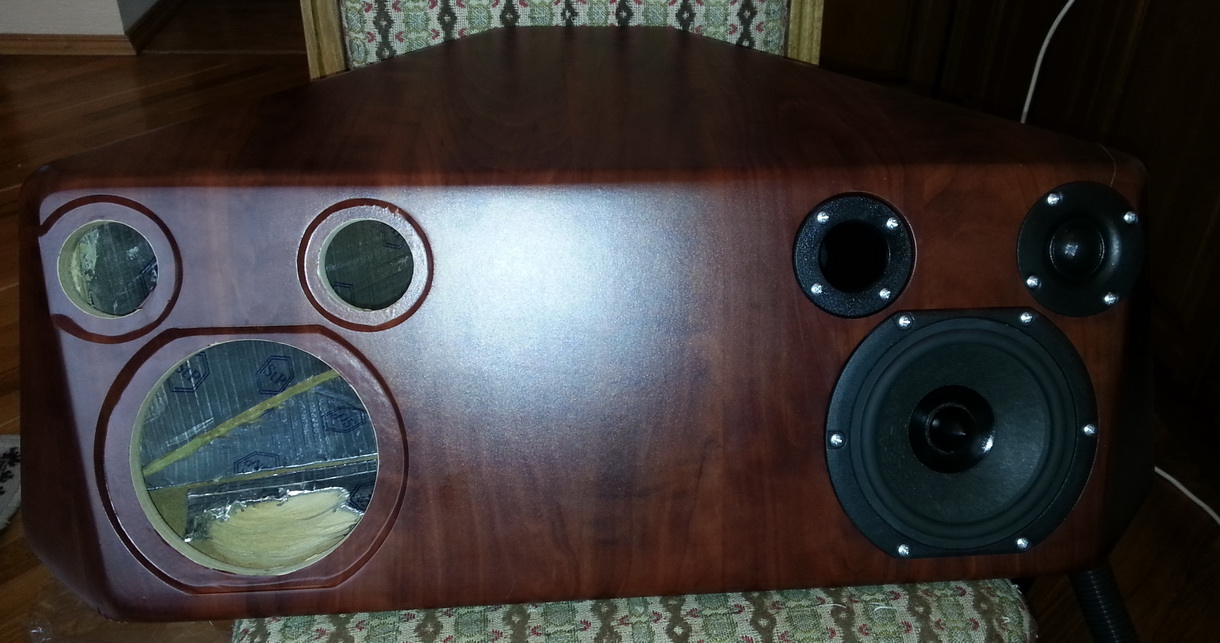 Корпуса внутпи проклеены шумкой (сырая резина с фольгой) сверху неё паролон рефлёный. Передние и задние стенки проклеены жидкие гвозди и через бруски прикручены на 4 самореза каждая. Кросоверы закреплены на боковых стенках при помощи 2х саморезов каждый, а так как они прижаты к паролону нет ни каких шансов на призвуки. Кабели от самих драйверов минимальны около 10 см. Колонки асиметричны на правой твитер справа а на левой слева (если что можно поменять). Ну и пару фото промежуточного процесса .... |