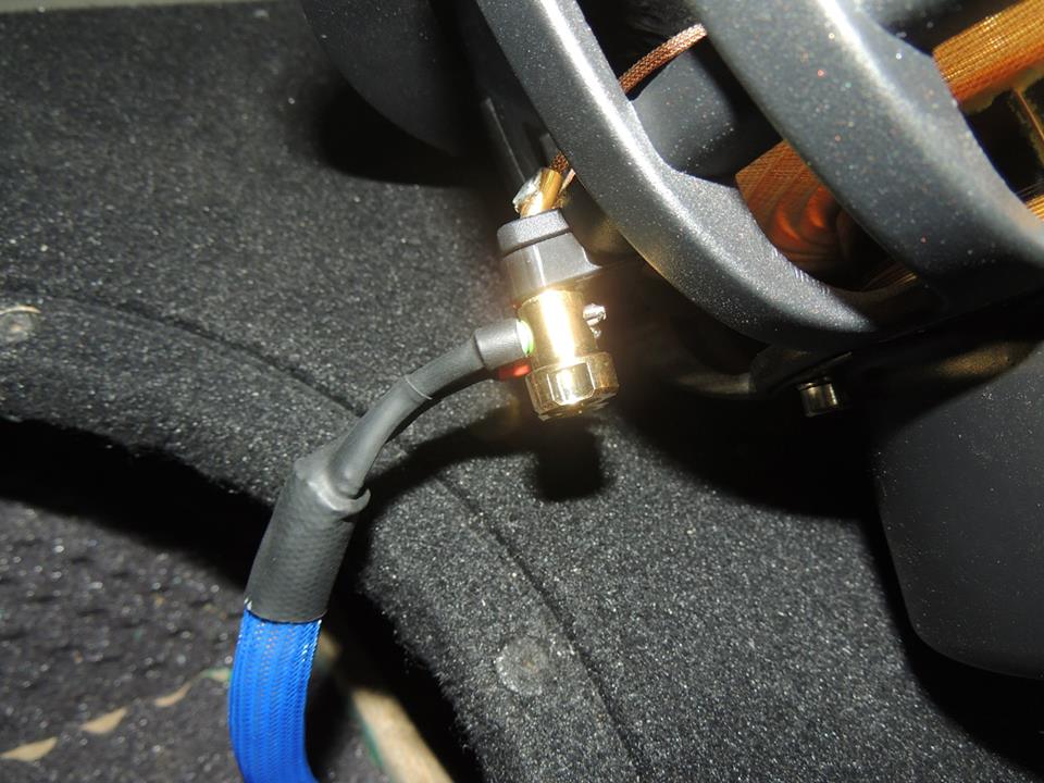 Кроссблок закрепленный на площадке под водительским сиденьем Закрепленный акустический кабель в пороге Акустический кабель закрепленный стяжками внутри двери выходит в родное резиновое отверстие, а затем в гофру между салоном и дверью Проход акустического кабеля через родной разъем в двери |