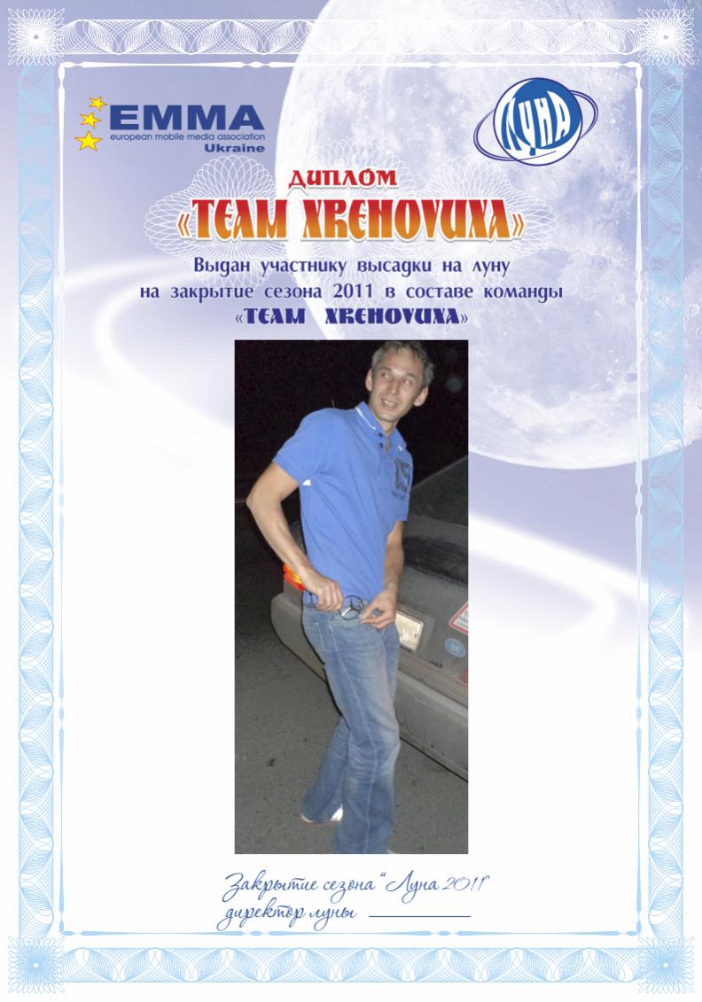 Спонсорам и партнёрам сезона 2011 были вручены благодарственные письма. Все линейные,Главные и судьи - администраторы были отмечены дипломами со словами благодарности за проделанную работу в 2011-м. Дипломы тех, кто не присутствовал - находятся у меня, перешлю. Дипломы россиян - у Полины. Единогласным решением в номинации "Спортсмен Года" лучшим был признан Марчук Вадим - Чемп Евро 2011. Диплом и Бронзовый Бюст на Родину Героя - уезжают в Винницу ![]() Всем присутствующим на закрытии были вручены памятные Дипломы об успешной высадке на Луне Настолько успешной - что некоторые до сих пор не помнят....многое