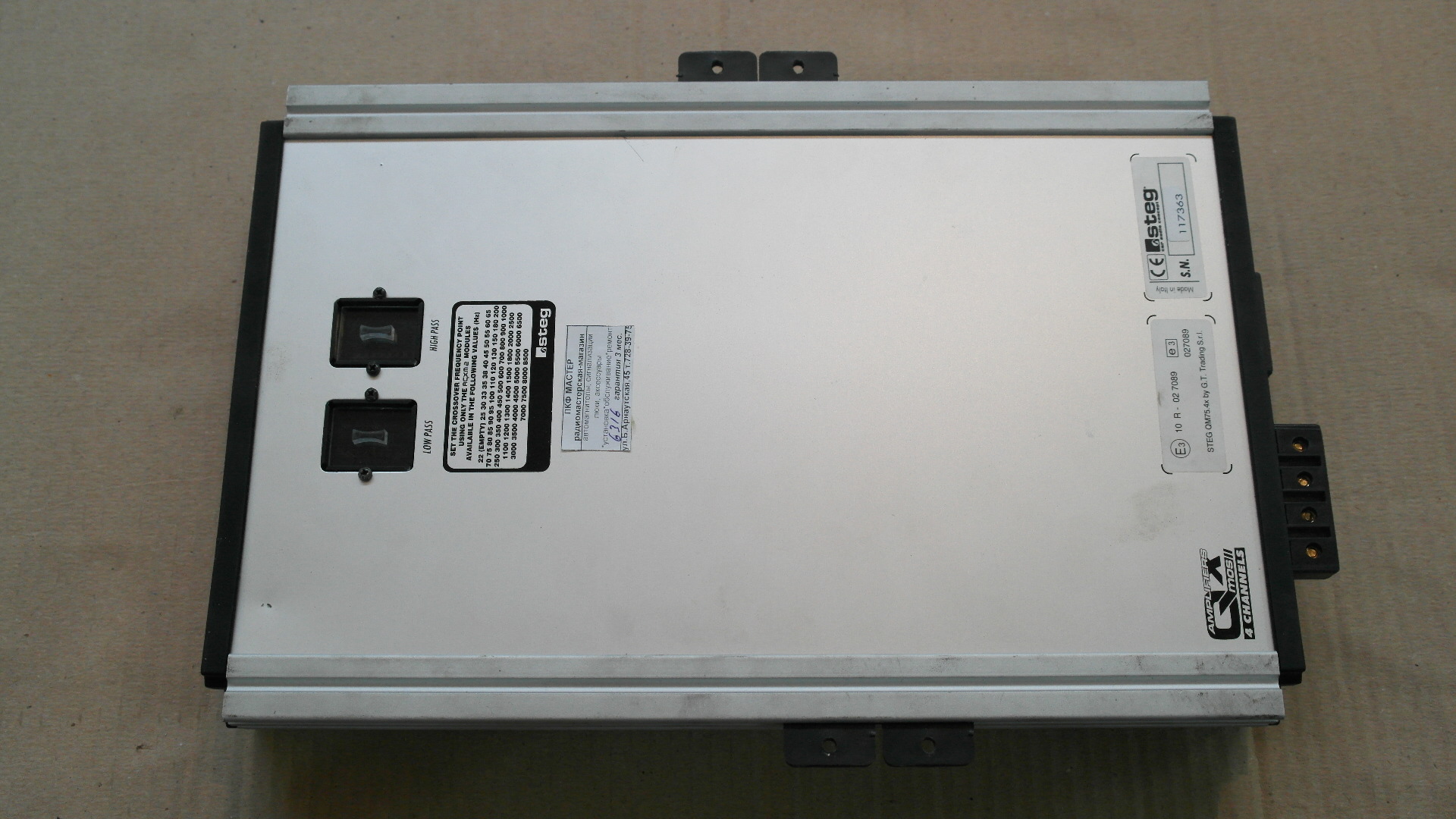 продам 4-х канальный усилитель Steg Qm75.4x, бывший в употреблении, внешне состояние нового, технически исправен, покупался новым у ОД около пяти-шести лет назад. был незначительный ремонт (замена диода) в радиомастерской, ни входные, ни выходные операционные усилители не менялись, блок питания так же не затронут. в комплекте лапки цена 180$ 067 467-39-53 Номинальная мощность в мостовом включении, 4 Ом: 250 Вт х 2 Номинальная мощность, 2 Ом: 125 Вт х 4 Номинальная мощность, 4 Ом: 75 Вт х 4 Габариты: 207 x 52 x 328 мм |