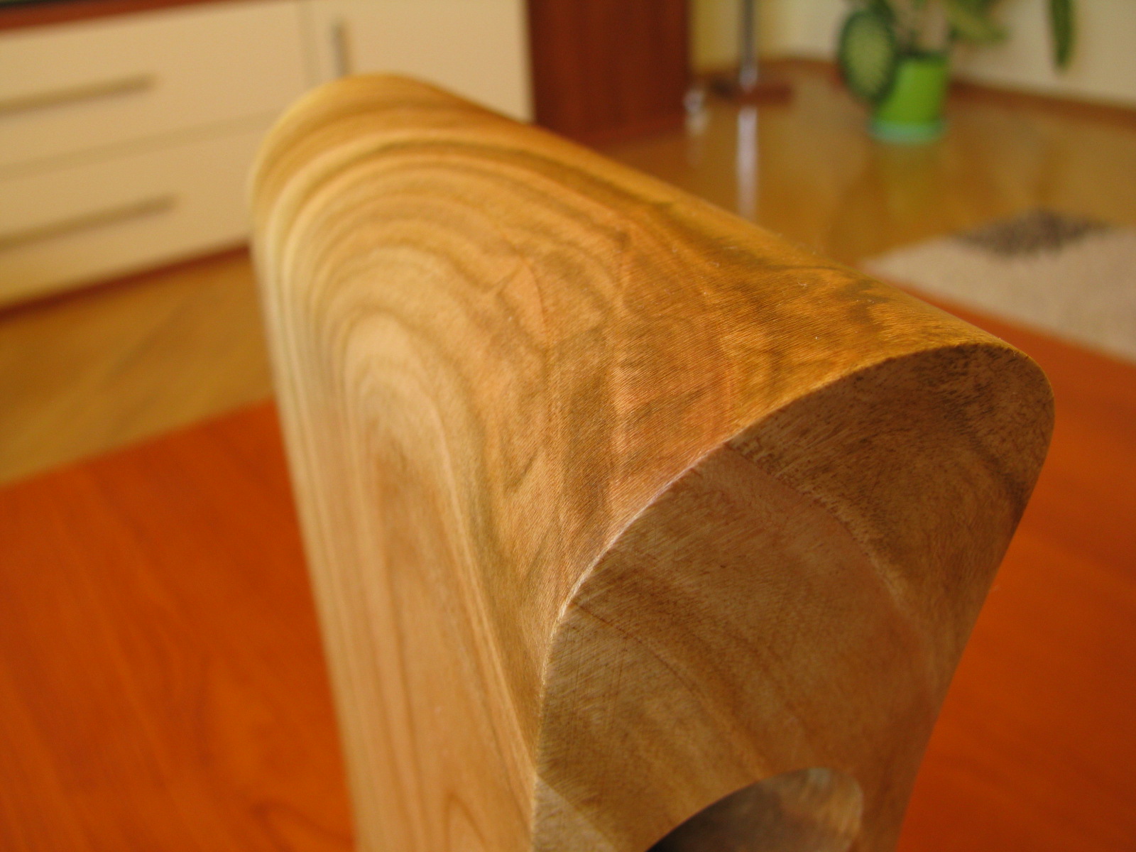 Очень красиво смотрится, древесина из прикорневой части с интересным рисунком текстуры и переходами цвета. Масло и воск особенно подчеркивают красоту древесины.