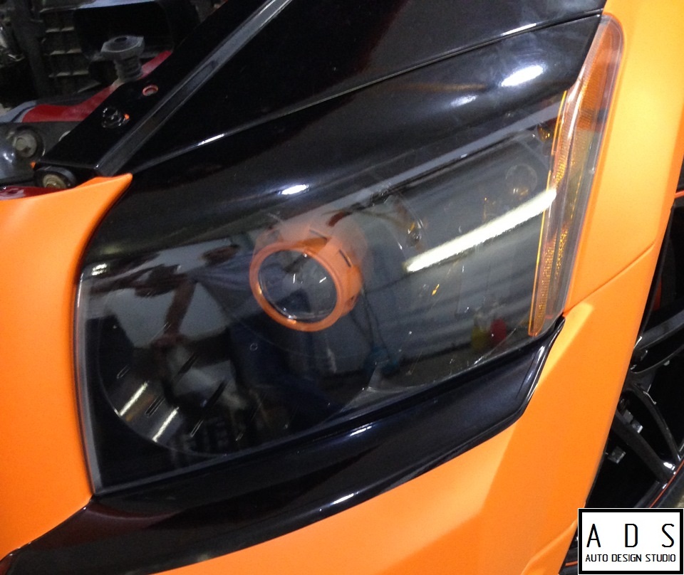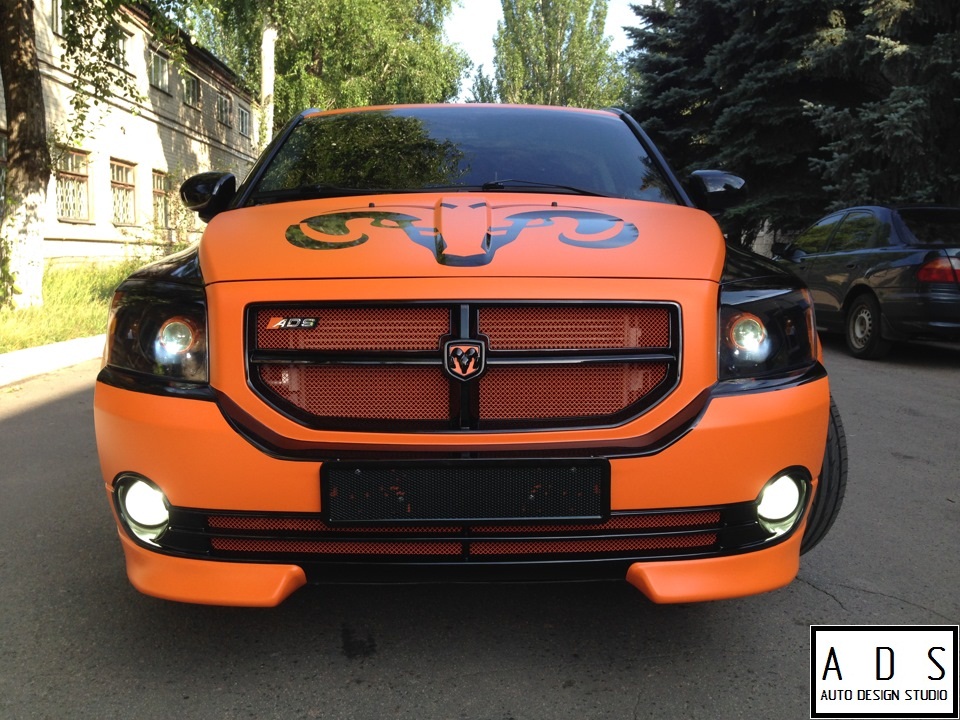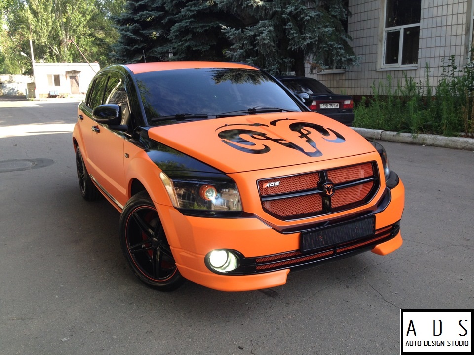 Работа над Dodge Caliber. Полная оклейка в оранжевый мат счерным, глянцевым стайлингом. Переделка переднего бампера и решетки радиатора. 4х этапная, порошковая покраска дисков VOSSEN. Покраска масок и установка би ксеноновых линз!