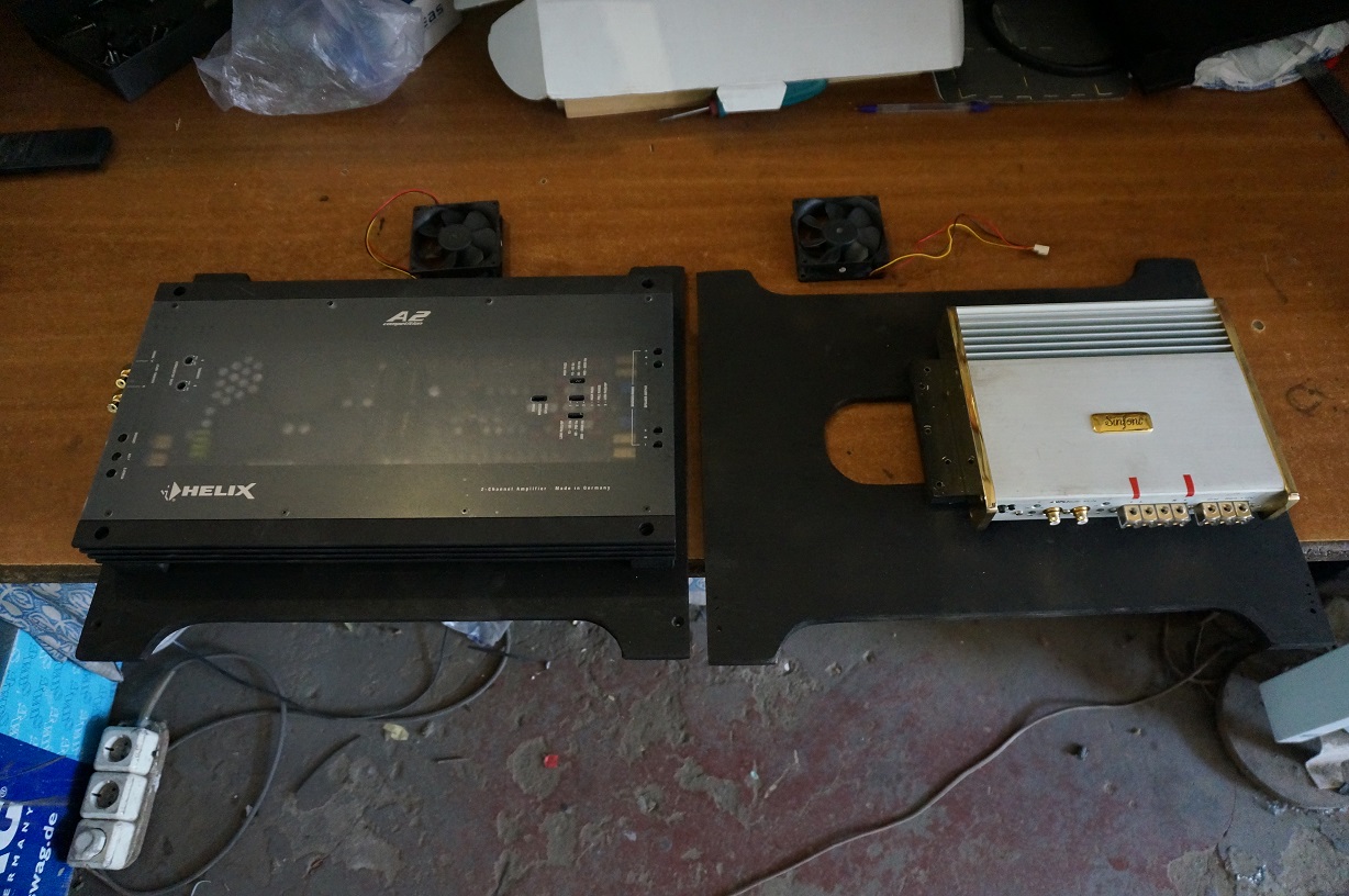 Продолжали делать фальшпанели для защиты ВЧ и СЧ/НЧ динамиков: точно совмещены ловители и втулки.... Подготовлены крепления головок на монтажной панели... Бокс для аппаратуры почти заверщен...КРАСАВЕЦ!!! с отверстиями для эффективного принудительного охлаждения. Далее трудоемкая и ответственная работа по подготовке к покраске!!! Уже знаем, что ЭТО такое!!! В полках для размещения аппаратуры тоже отверстия для потоков воздуха и проходы для кабелей. Ну и как уже упоминал...повышаем уровень и класс компонентов: на миды Brax 6.1PP примеряем достойный Helix A2 Competition с Рном = 2 х130Вт. А он еле,еле вмещается из-за торцевого расположения выходов и входов. Но с угловыми разьемами DLS все вопросы решаются...))) Не факт, что в окончательной редакции останутся упомянутые миды и усь для них......соберем, настроим, прослушаем, примем решение......Вариантов хватает... НУ, а параллельно ищем мощный трансформатор с готовой первичной обмоткой ( кстати, может кто здесь предложит??? ), высококачественные регуляторы громкости ( ALPS ) и т.д.... |