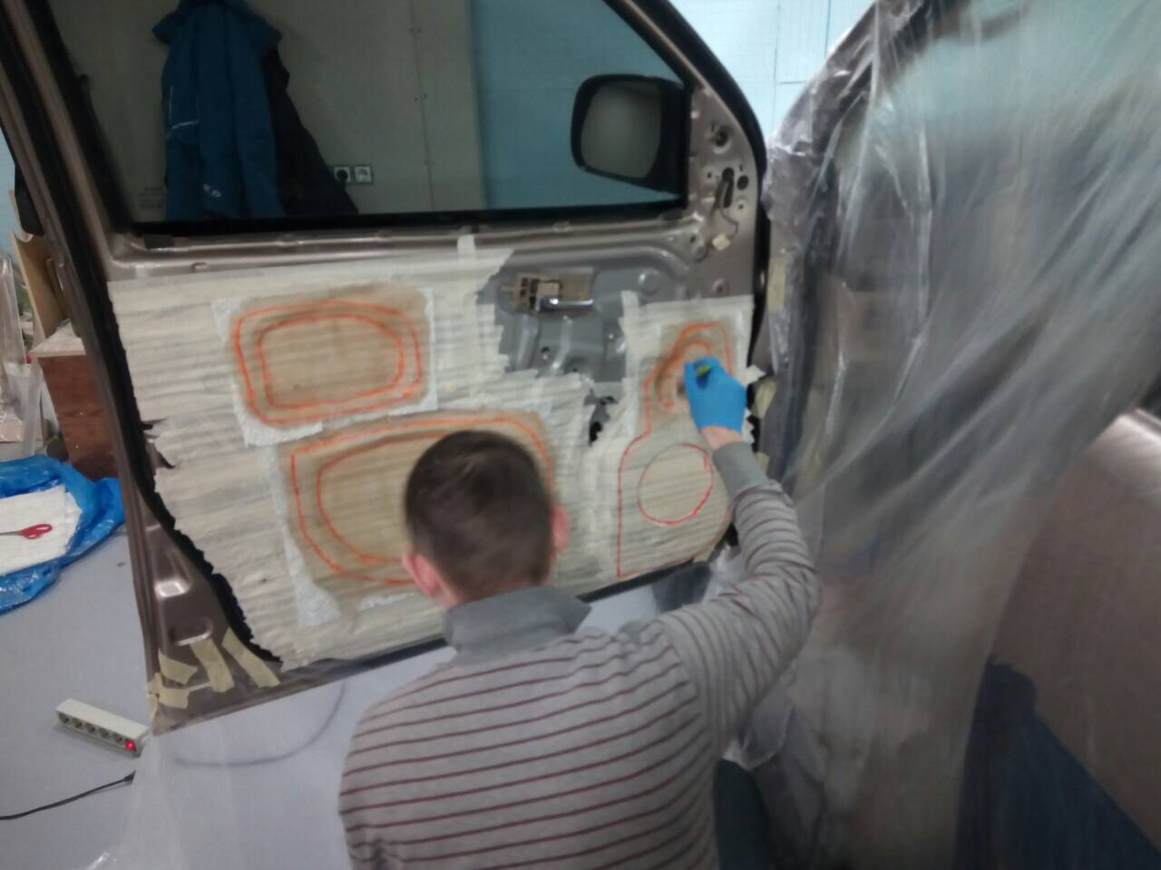 После установки заглушек, филенка полностью закатывается в виброизоляцию. Это вид готовой двери перед установкой карты. Посадочное место для мидбасса имеет максимальную жесткость, что очень сильно влияет на качество звука.