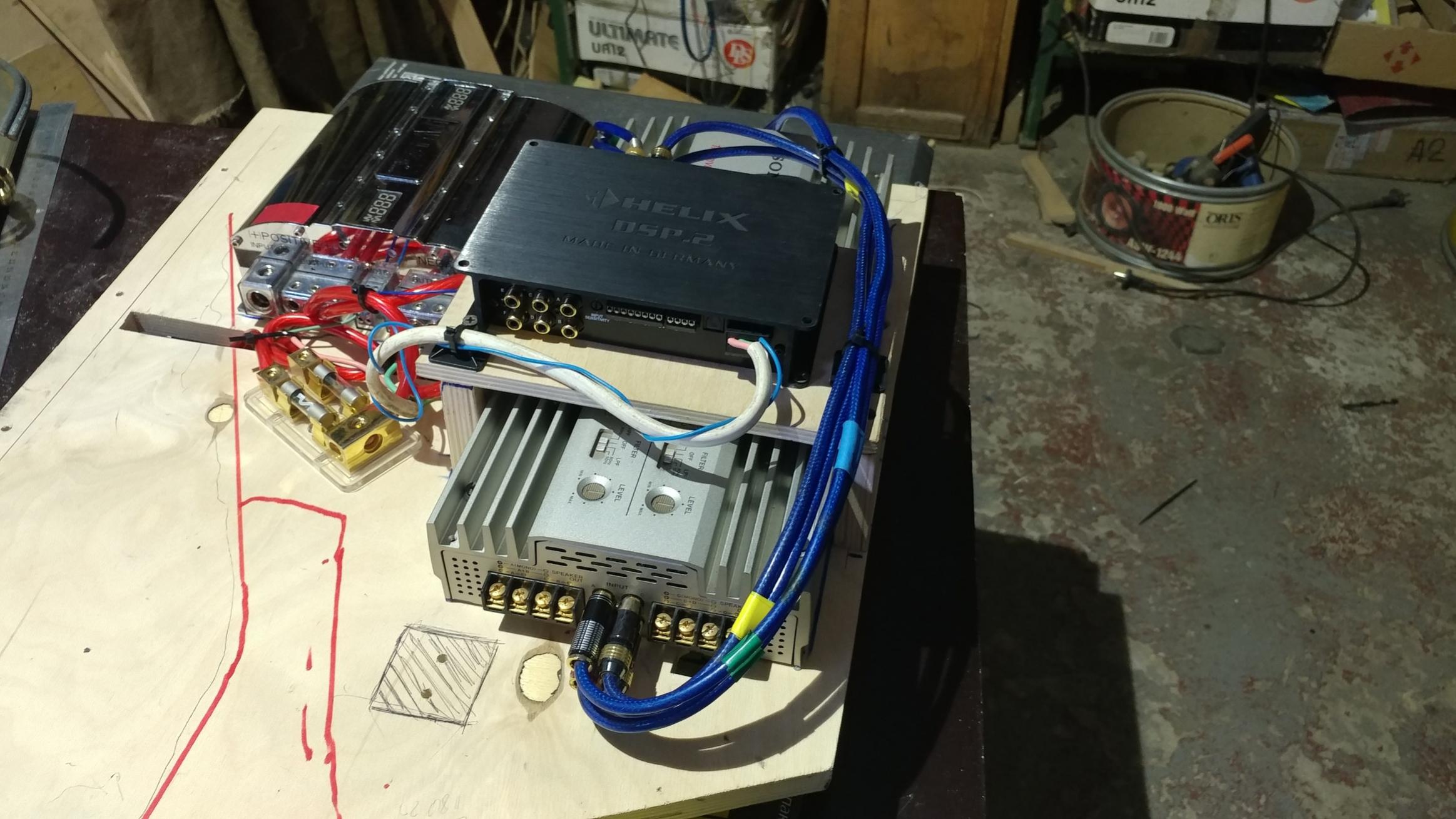 Продолжили расширять и укреплять фанерой и полиэфиром штатный обьем саба. Установили твиттеры на штатные места...плохо, конечно, но....вариантов нет. Разместили часть усилителей и процессор в аппаратном блоке