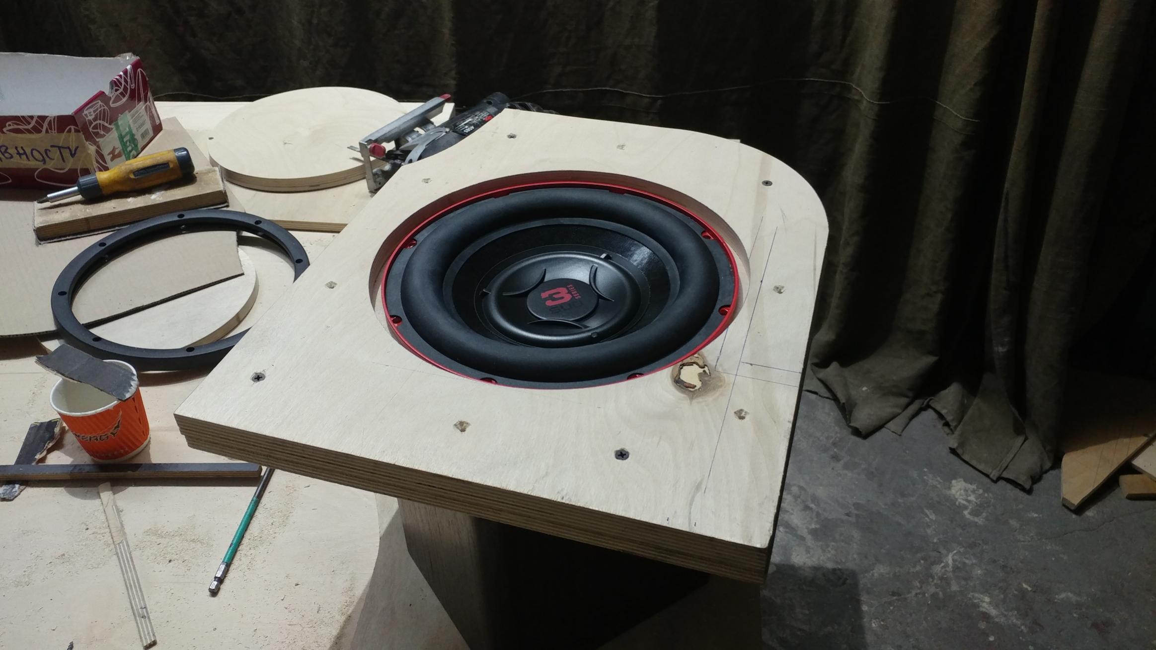Приступили к изготовлению корпуса саба...используя штатный, заметно его усиливая...полиэфирная смола, фанера и т.д. Заодно увеличиваем обьем до...примерно до 20 л. Мидбасы приняли решение установить на картах....соответственно готовим прочный подиум, усиливаем шумовиброизоляцию карты