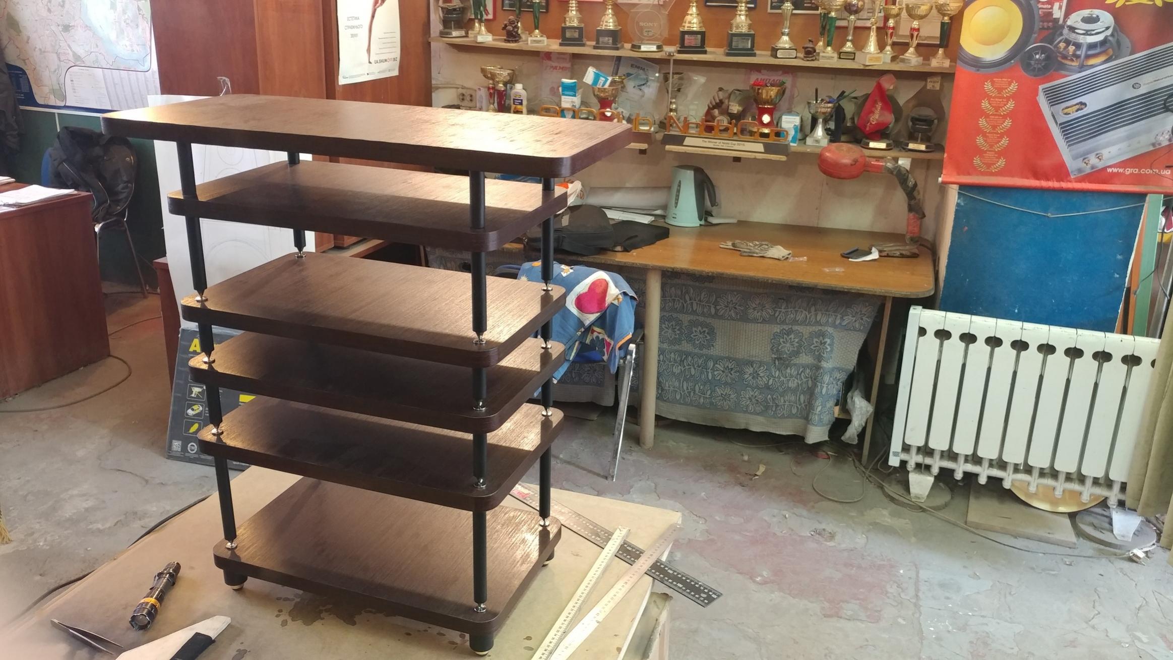 В процессе изготовления аппаратной стойки для проекта ПИРАМИДА пришли к выводу, что и для проекта Satory подобная стойка понадобится...уж очень симпатичной и функциональной она получается. Правда, с некоторыми отличиями: чуть меньше размеры полок, верхняя полка большего размера с учетом возможности установки телевизора или чего другого, уменьшено общее количество полок с 7 до 6, мет. опоры уменьшены в диаметре с 32 до 20мм, ну и соответственно применены меньшие опорные конусы. Естестенно шпон выбран одной цветовой гаммы с акустикой. Получилась заметная экономия в себестоимости...а в качестве звучания...послушаем... Конструкция разборная, есть всегда возможность что то поменять /изменить....