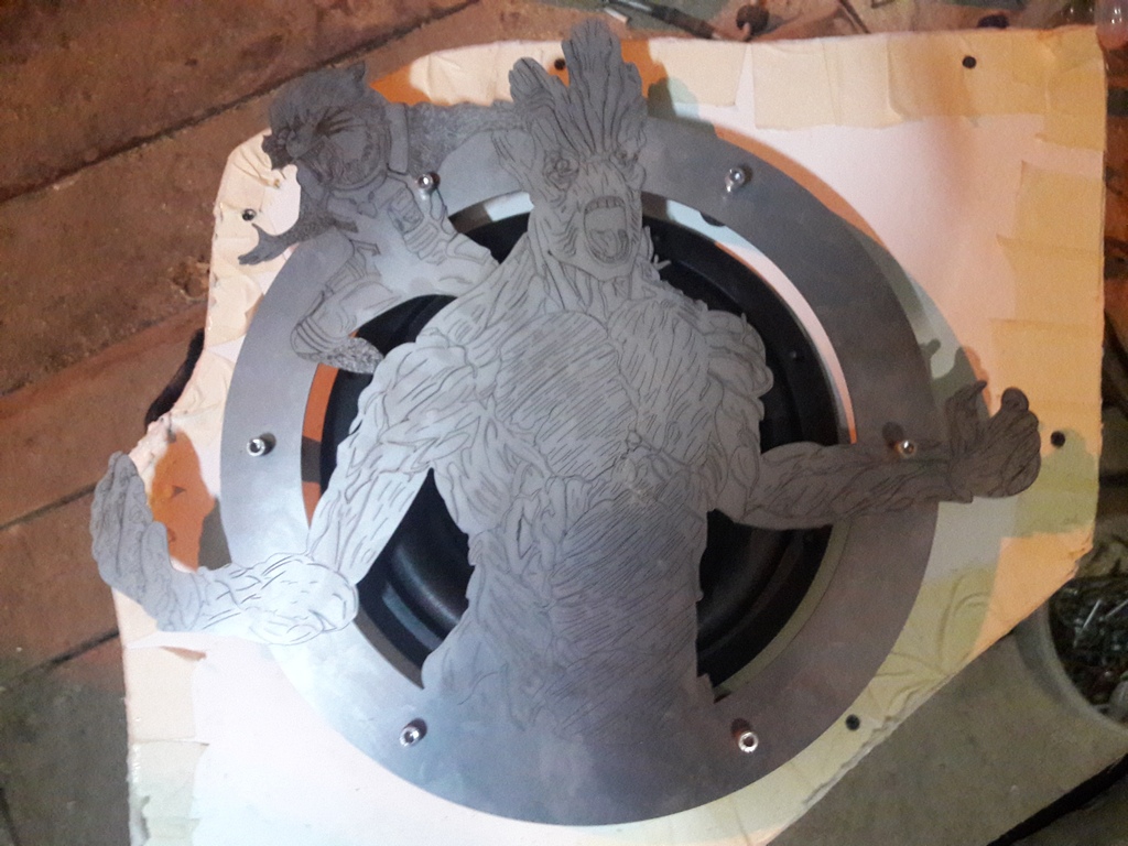 Делюсь своим очередным опытом. DISCLAIMER: Все персонажи и торговые марки, упомянутые в данном посте, принадлежат их правообладателям. Я не претендую ни на какое авторство. Пост и проект созданы в личных целях без какой-либо коммерческой выгоды. Итак, старенький Seat Cordoba 94 года. Вообще-то это машина тестя, и приехала она в Харьков из Краматорска совсем не для музыкального тюнинга. Надо было капиталить мотор. Естесственно, пожилой человек уже с трудом осилит такой ремонт самостоятельнj, вот я решил сдлеать ему такой презент. Мотор мы сделали, и мне стало скучно. Без ведома тестя, я решил немного попрактиковать свое хобби. Находясь под впечатлением от недавнего просмотра «Стражей галактики», а также от прослушивания саундтрека к фильму (а он очень достойный) , я решил создать саб в тематике «Стражей». Как обычно, размещение саба - в боковой нише багажника. Решил попробовать создать корпус stealth при помощи сендвича из деревянных панелей. Начал вырезать понемногу и накладывать панели друг на друга Собрал основную скорлупу, стянул, склеил, загерметизировал Скриншот из фильма я распечатал на самоклейке типа «Оракал». Это декор для лицевой панели саба. Вырезал лицевую панель и место под терминалы Обрабатывал внешнюю поверхность саба лепестковыми кругами, шпаклевал, шлифовал, лакировал, шкурил. Долго и муторно Примерил динамик, опорное кольцо, решетку-гриль Гравировка на решетке выглядела очень блекло и тускло. Добавил контраста Обтянул корпус карпетом. Немного накосячил со швами карпета, но это тыльная сторона, не смертельно Смонтировал лицевую панель, выровнял ее поверхность Поклеил декоративную пленку со скриншотом из фильма на лицевую панель |