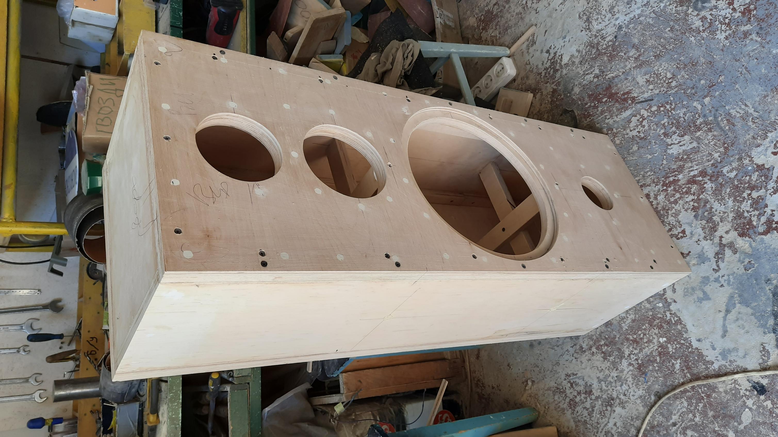 Коллега- иногородний заказал корпуса АС для интересного авторского проекта на базе доработанных квалифицированным мастером советских динамиков ..все не помню марки, но НЧ , кажется , 100 ГДН какой то. Отзывы обладателей таких АС очень хорошие....интересно...Ну, а наша задача сделать качественные корпуса ( фанера толщиной 30 и 40 мм , мощные распорки, шпонирование и т.д.)