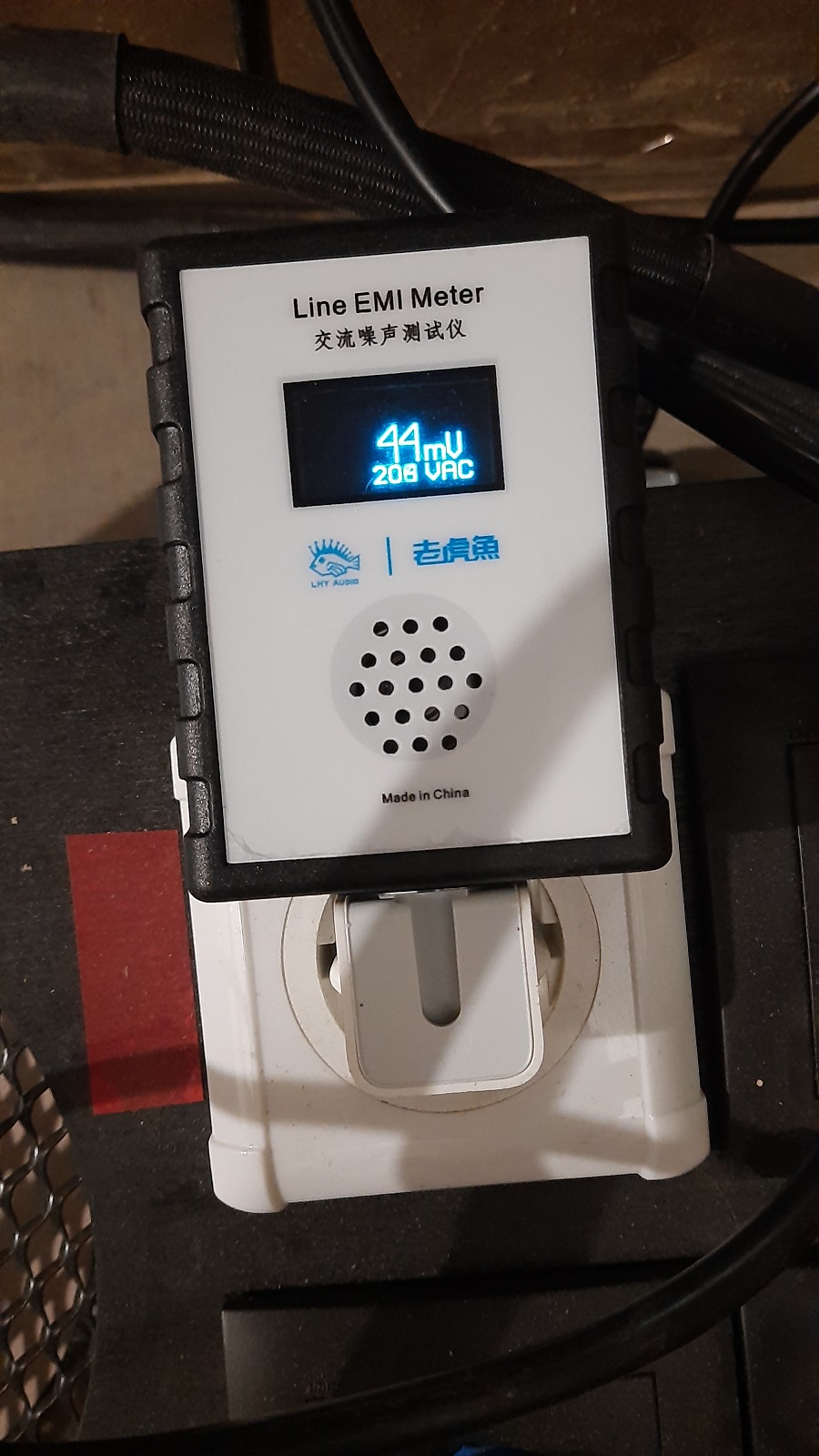 Фокусировкиа и др. ) .Под рукой оказался прибор для измерения ВЧ помех в сети. Замеряли в нашем боксе до и после блока питания. И визуальный ( см.фото 598 мВ и 44 мВ) и звуковой ( при больших помехах прибор громче…верещит))) результат налицо