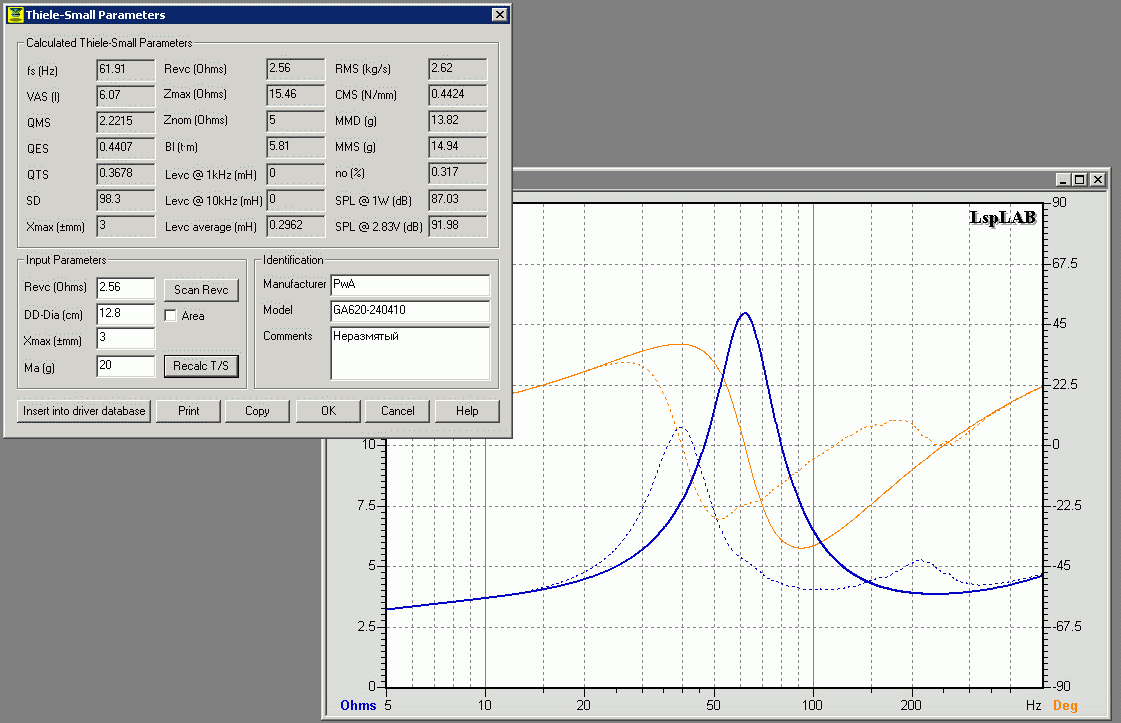 я тож мерял, вышло эквивалентный 7л, добротность 0,38, резонанс 60 (после разминки правда)