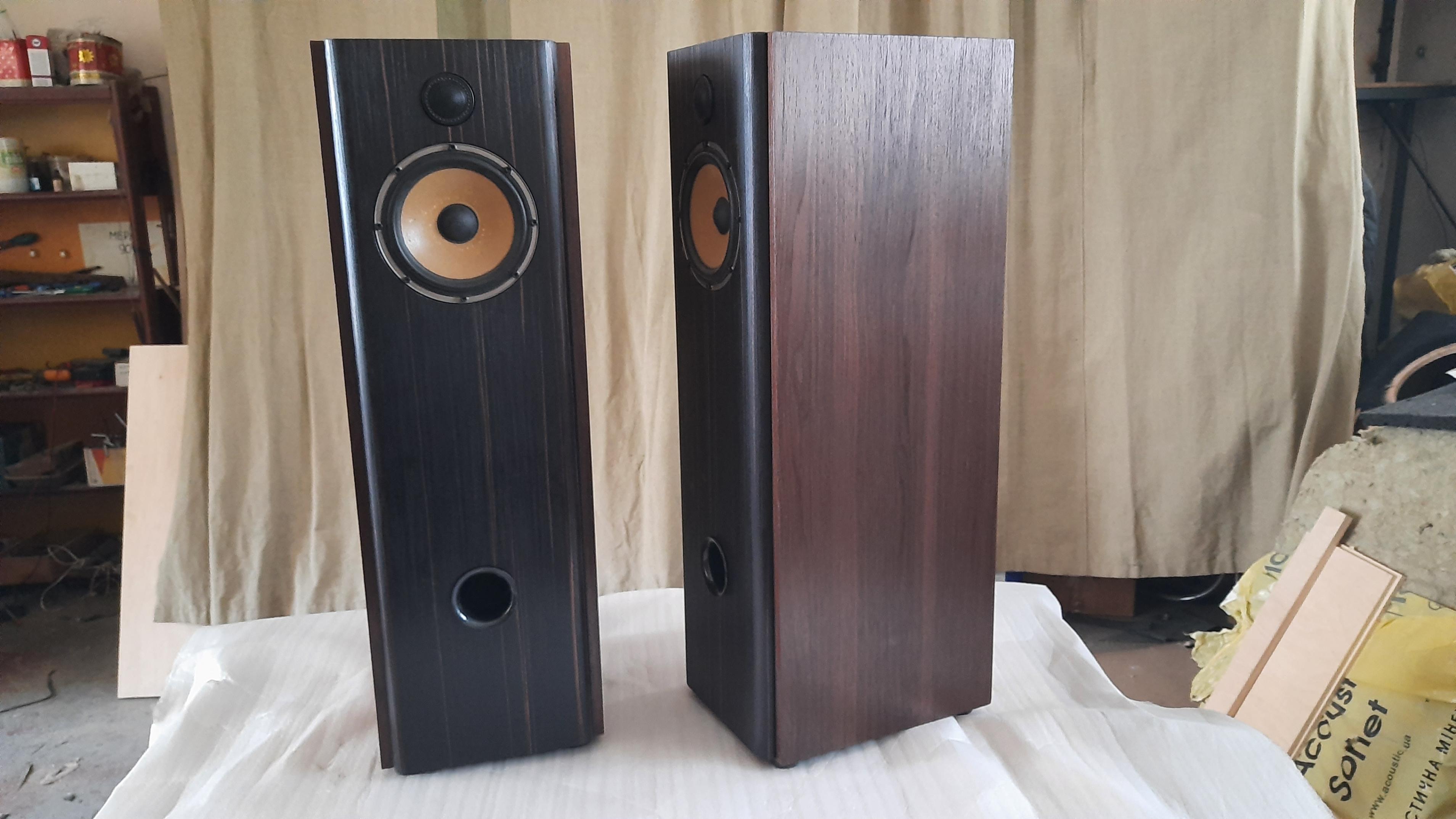 Итак, в продаже 2х полосные АС на базе качественных топовых НЧ динамиков Eton Adventure и шелковых твиттеров Diamond Audio HEX. Кроссоверы Eton Pro c доработанной ВЧ секцией ( использованы конденсаторы Clarity Cap CSA 3,9 mF, фильтр 1-го порядка ). Конструктивно выполнены мощно и качественно, отделка 2х цветным итальянским шпоном. Основные технические данные: