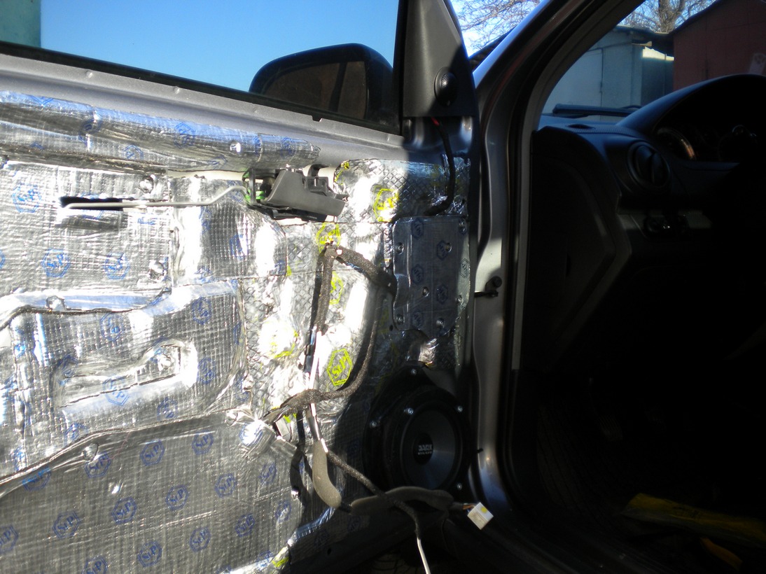 Дверные карты обклеил скотчем, укрыл полиэтиленом на всякий случай и положил три слоя 600 - го мата