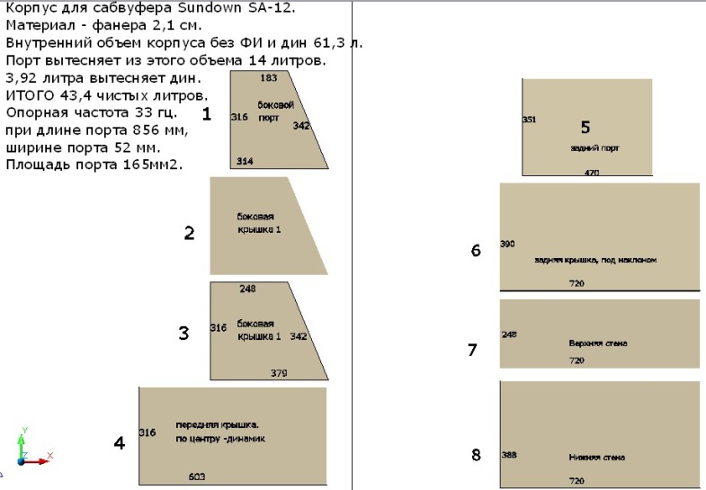 длина порта 420+230 это 650 или 65см(не доглядел - с учетом толщины стенок еще +4см-итого 69см).А порт указан 75см длина. При 65см длине объем ящика (и это без без учета динамика,но с вычетом объема фазика и его внутренней стенки) выходит в районе 49л, а при 75см в районе 46л(соответственно при 69см где-то посередине).И где тут правда? Может лучше таки не лениться, а считать самому.Действия то простые. Последний раз редактировалось ФАНТОР; 21.10.2011 в 19:39. Причина: Добавлено сообщение |