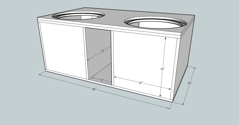 от производителя не подходит? постоить ЗЯ проще простого, если просто квадратный нужно чистого 26,4л + сам саб литров 4 = 30.4л внутр размеры: В36 х Г24 Ш36см + толщина стенок (я б делал 2см) |