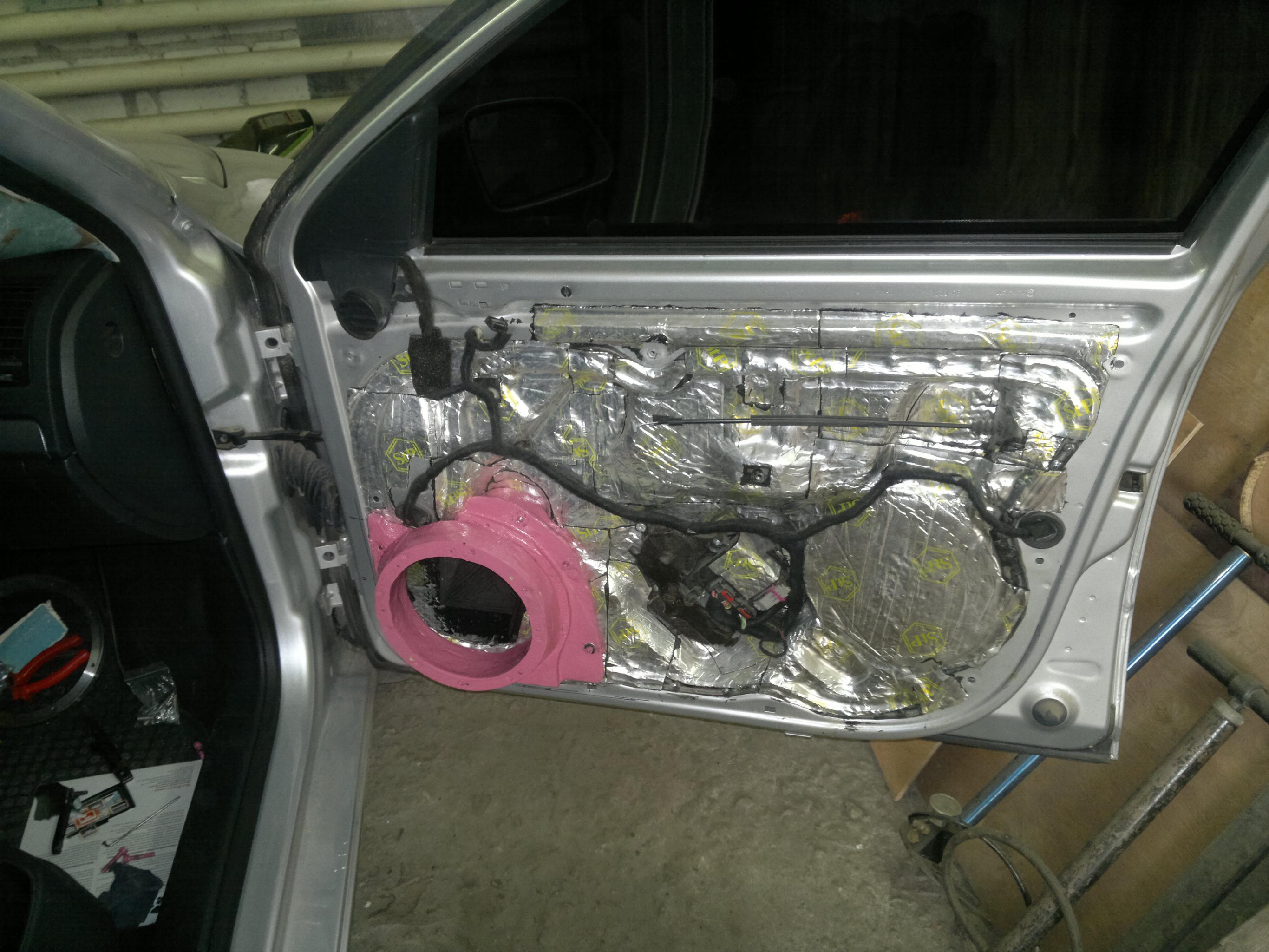 После перерывов на лето , продолжаем доделывать двери . Еще весной были куплены мидбасы иридиум 8 . За дином приклеил акустическую линзу , первый раз клеил на резиновый клей , при перепаде температур линза начала отваливаться , второй раз переклеил на стекольный герметик крокодил . Внутрений подиум по периметру проклеин тем же крокодилом для большей плотности посадки .