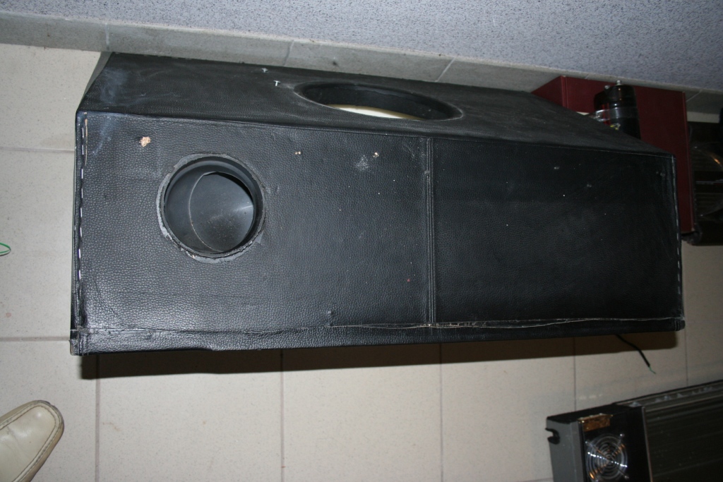 Корпус ФИ. Диаметр фазика 100мм. НА сколько настроен не знаю даже. Корпус очень добротно сделан. Обклеен кож.замом. Передняя панель скошена для выхода саба в подлокотник. Задняя стенка стеклянная с подсветкой сверху. За грилем видно магнитную систему саба, которая тоже подсвечивается. Корпус проклеен виброй. размеры. В корпусе есть клемник. Как то так.