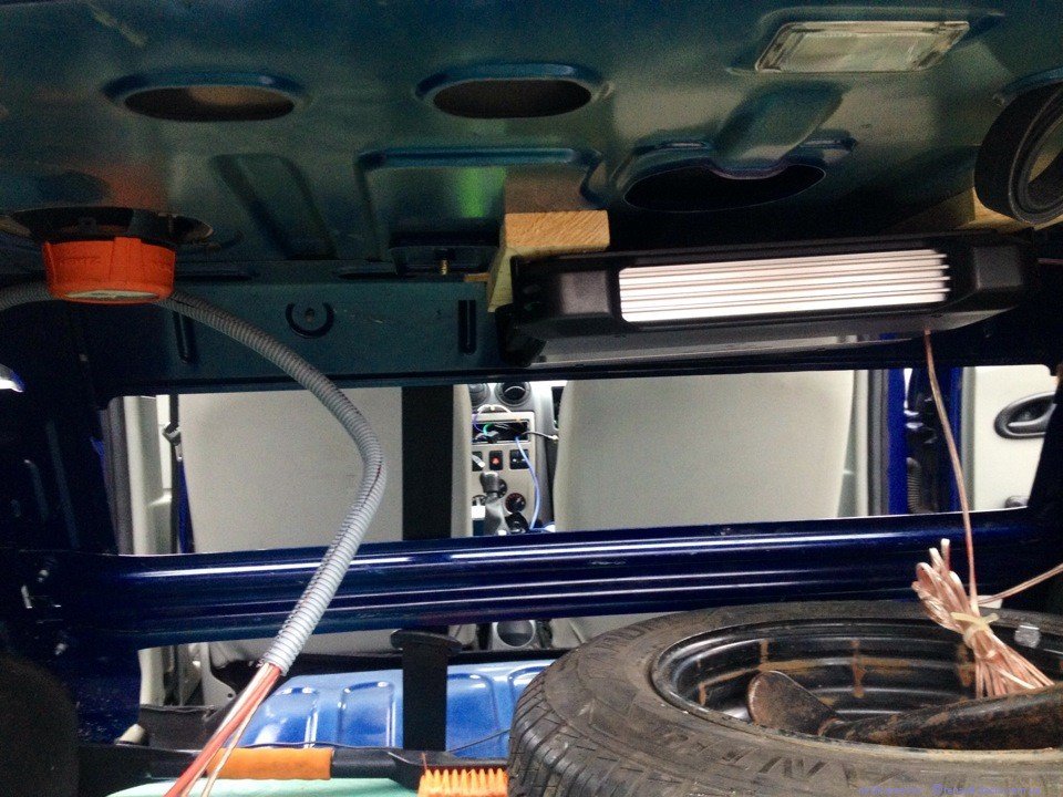 Фронт Hertz EV 165.5L в дрерях на подиумах с доворотом + Hertz ET 26.5 на слепленых подиумах в стойках лобового, направление навхрест на подголовники. Усилитель Blaukpunkt VA-475 установлен в багажнике под полкой на двух деревянных брусках, так как полка не ровная. Межблок самодельный на кабеле Klotz АС110. Саба пока нет. На днях закончу сборку ЧВ на двух динамиках 34гд-10. Мне не нрав, что высокие завышены... как-то сильно цокает и пшикает. Пробовал тыкать перед твитером керамические резисторы на 2.0 ом, но все равно... Кстати кросоверы сейчас стоят от двухполоски морель максимо. На динамики в полке не смотрите, их там уже нету ![]() Дырки в полке прикрыты заводскими сетками, все по феншую