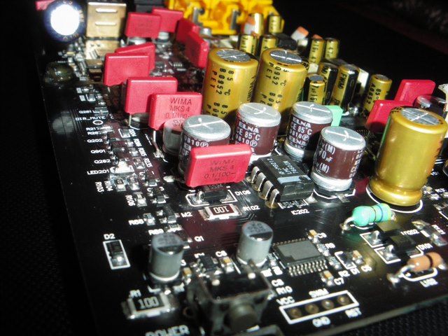 Приятный сюрприз - в этом ЦАПе полностью отсутствуют межкаскадные ("проходные") конденсаторы на пути аналогового сигнала! Спасибо двуполярному питанию и балансной схеме, все электролиты, которые видны в аналоговом тракте, стоят по питанию. А это очень важная особенность для получения хорошего звука.