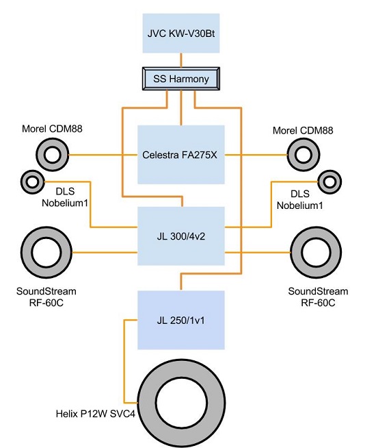 ![]() В пару к ним прикупил Soundstream rf-60c, басят конечно ураган, да и отправил усилок жабаэль с кроссами нобелиума на покой, заменив его JL 300/4 и подключил в поканалочку. А тем временем еще пришлось сменить голову, пионерка у меня была всего с 2мя парами линеек, а сменил я ее на Sony XAV-602BT, хотя многие тут говорят что сони не умеют ничего делать, но мне аппарат понравился наличием временных задержек, это позволило свести сцену и воспроизведением WAV с флешки. чуть позже будут фото