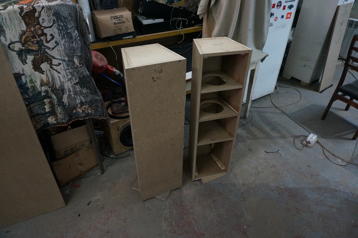Тоскливыми зимними вечерами вдруг нам, небольшой команде единомышленников, навеяло.....а не попробовать ли изготовить своими силами ( в основном ) качественную домашнюю аудиосистему. Тем более ,что работой не загружены,а руки чешутся что то интересное сделать. В последний раз акустику делали своими руками лет.....25 назад. А если получится удачный проект, то можно использовать и как референсный тракт при настройке автомобильных систем и не бегать по аудиосалонам, а может кому и из клиентов приглянется! Проект довольно длительный по времени, т.к. финансы очень ограничены. Поэтому периодически буду освещать фото и краткими описаниями наши этапы!)))) Не исключаю, что можем и не завершить его)))), если на каком то этапе поймем бесполезность этой "авантюры"))))). Итак, на скорую руку из того что было слепили тестовые герметичные короба различных обьемов для прослушивания акустики, выбора вариантов и т.д...