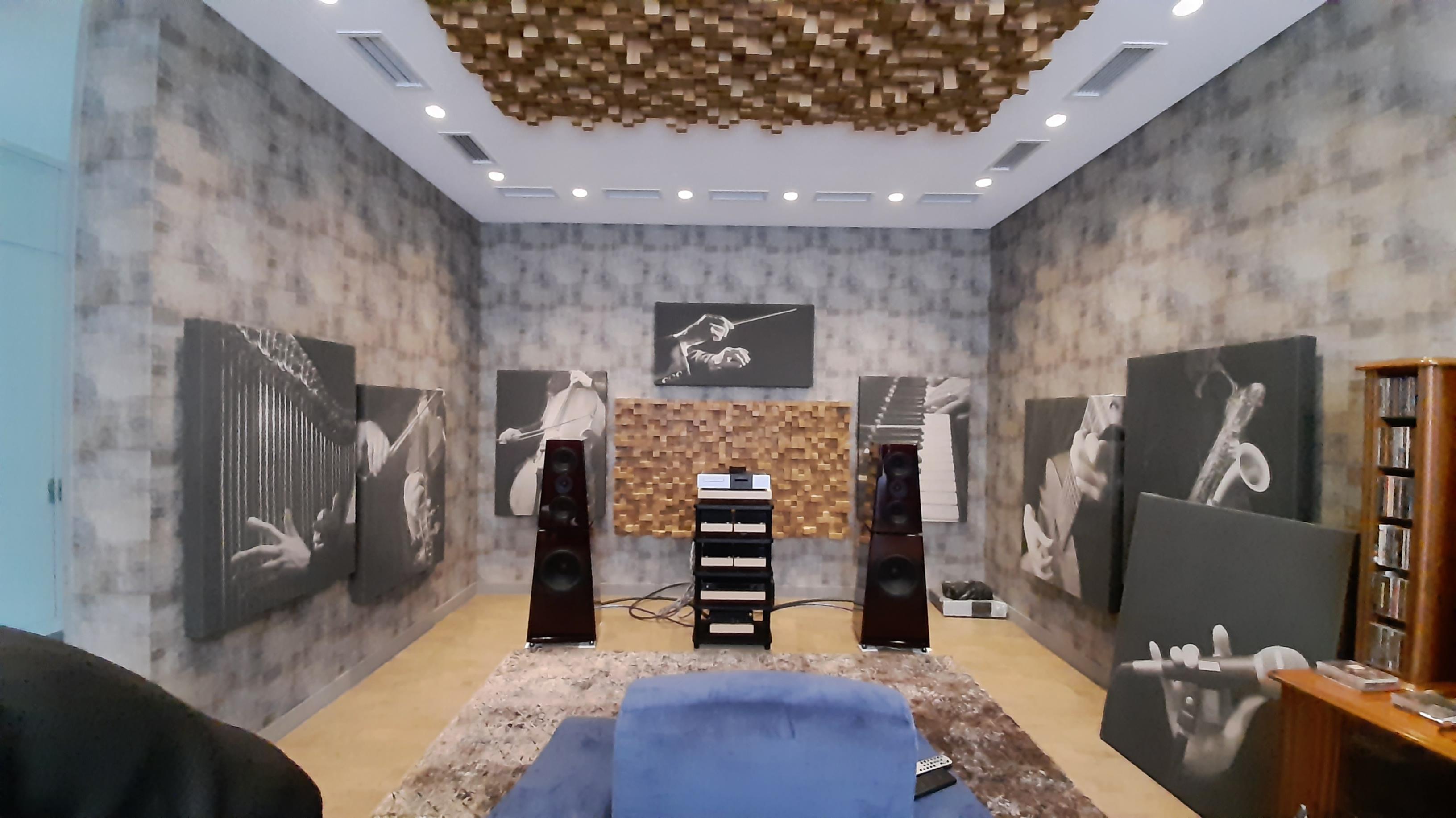 Итак, наконец то тема с акустическими панелями в данном проекте сдвинулась с места...очень долгий и кропотливый путь ( отработка конструкции, прослушивание , замеры с использованием макетов, выбор материалов для финишного оформления и т.д.))) Панели развешены и закреплены, сегодня было пред финишное прослушивание... Впечатления: фокусировка, локализация просто отличные! Впечатляют масштабность, целостность звуковой картины, энергетика, мощь.... Это , если бегло.... Сами панели отлично "встроились" в общую картину комнаты для прослушивания ( это наше обоюдное мнение с Заказчиком ) Ну, а он сам решился на новый ковер....ждем его появления))) А далее прослушивание и финишная доводка аудиосистемы....