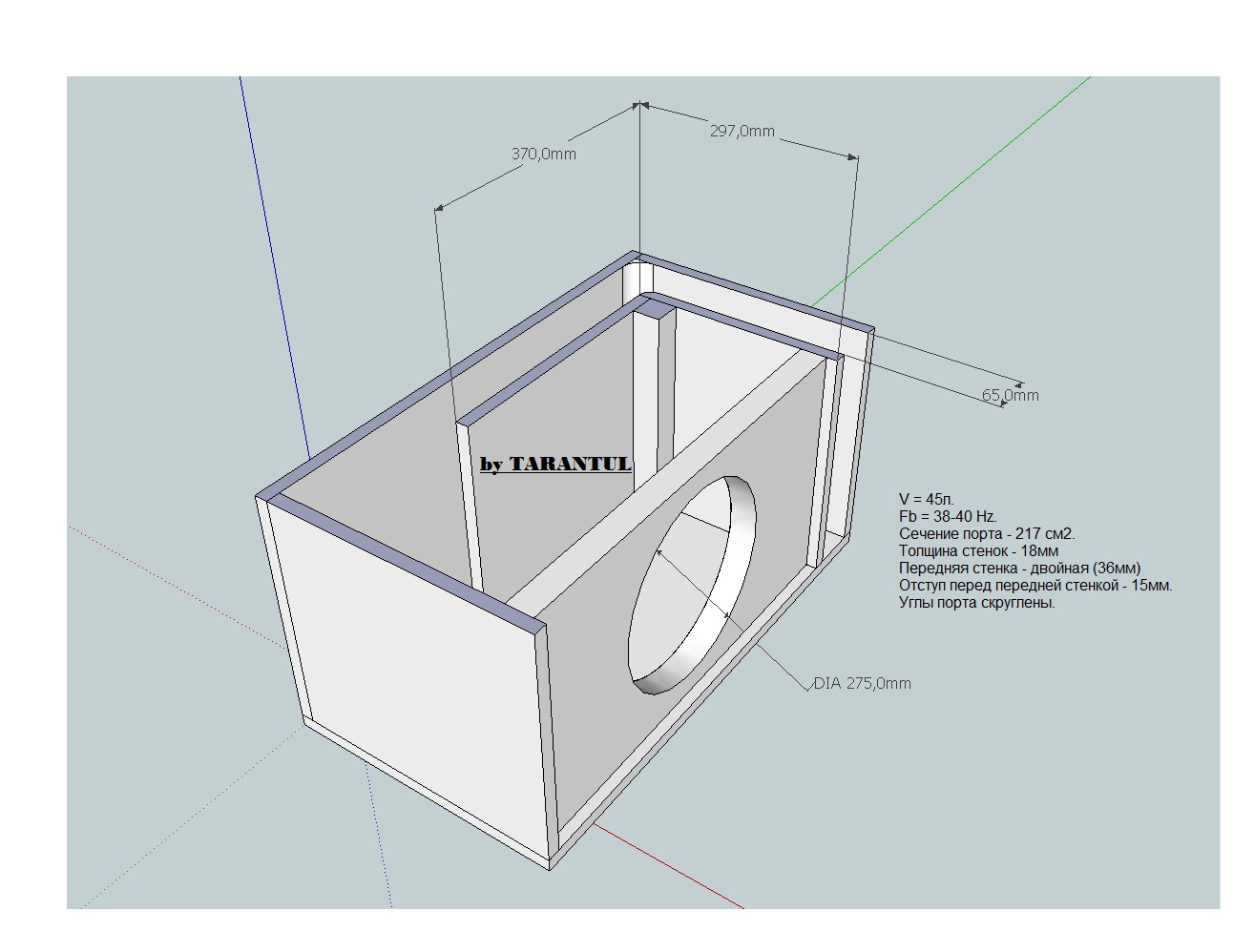 длина порта 420+230 это 650 или 65см(не доглядел - с учетом толщины стенок еще +4см-итого 69см).А порт указан 75см длина. При 65см длине объем ящика (и это без без учета динамика,но с вычетом объема фазика и его внутренней стенки) выходит в районе 49л, а при 75см в районе 46л(соответственно при 69см где-то посередине).И где тут правда? Может лучше таки не лениться, а считать самому.Действия то простые. Последний раз редактировалось ФАНТОР; 21.10.2011 в 19:39. Причина: Добавлено сообщение |