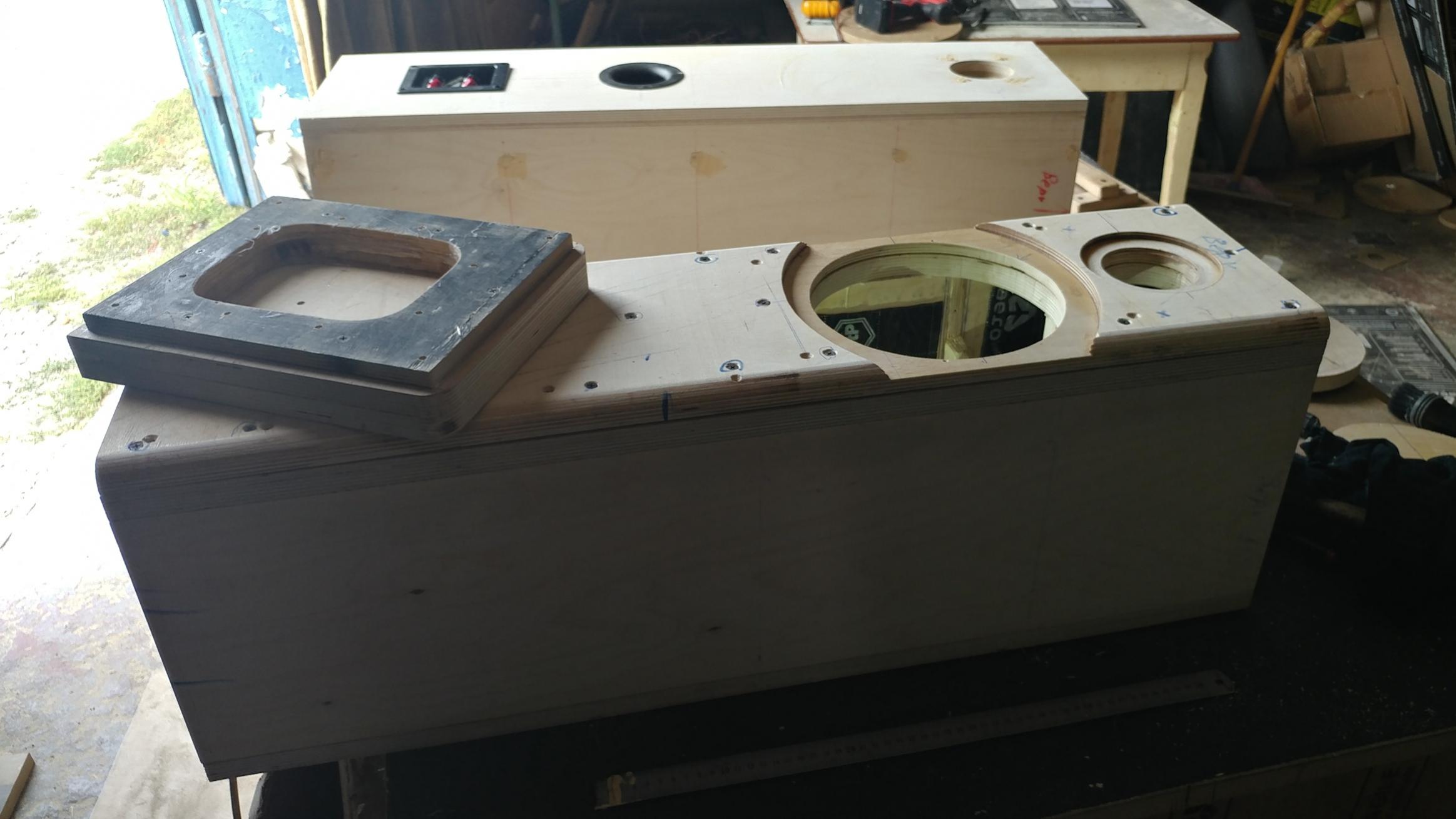 Две ночи не спал, слышался вещий голос Монохреновча.....далеко разнесены динамики... А он в ...17% случаев бывает прав!! Поэтому заделали старые посадочные отверстия под НЧ динамик и перенесли его ближе, практически вплотную...к ВЧ. Ну и , вчерне завершили изготовление корпусов, подготовку под шпон... Переходим к изготовлению пасс кросов, они уже рассчитаны, комплектующие и материалы под них получены...