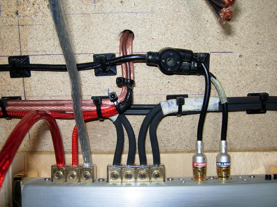 Обратите внимание: два красных провода снизу стянутые ЧЕРНЫМ ХОМУТОМ (с завода) - штатные плюсовые провода от АКБ в багажнике через всю длину кузова в подкапотное пространство - на стартер и генератор. Это штатные кабеля БМВ с завода!! Провод над ними стянутый БЕЛЫМ ХОМУТОМ - это мой главный и единственный силовой провод питания системы. Все остальные провода на фото - штатные. Так вот: на ЕММА 2006 "Кубок стран Балтии" всем известный и уважаемый мной лично Эдуард Шокола (Россия Белгород), судивший инстал в моем классе EXPERT. легко и непринужденно тыкнул меня носом в этот провод и с радостью энтузиаста (типа "Солдат, ЭТО - ЗАЛЕТ!!") поставил мне НОЛЬ баллов за защиту проводки!! Провод не в гофрике, мля..!! Проводка - не защищена:comando:!! На мои детские возражения типа: "а как же заводские провода БМВ идут через весь кузов сзаду наперед под капот на стартер и генератор не в гофрике?? И это в авто люкс класса?? Которое технически сдано в эксплуатацию и запущено в массовое производство в Германии?? А мой 40см ТАКОЙ ЖЕ СИЛОВОЙ ПРОВОД из той же точки подключения, что и штатный - должен быть в дурацком китайском куске гофры 40см??? Нсть логика??" - был получен ясный, четкий, вразумительный ответ: "штатную проводку - мы не судим!! Если ты поставил свой провод к доп.оборудованию-аудиосистемы значит ДОЛЖЕН ЕГО ЗАЩИТИТЬ (то бишь запхать в китайский кусок гофры или змеиной кожи)!"