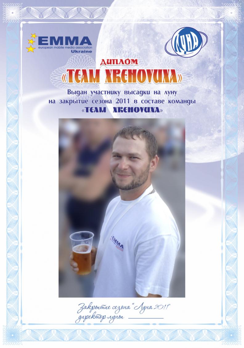 Спонсорам и партнёрам сезона 2011 были вручены благодарственные письма. Все линейные,Главные и судьи - администраторы были отмечены дипломами со словами благодарности за проделанную работу в 2011-м. Дипломы тех, кто не присутствовал - находятся у меня, перешлю. Дипломы россиян - у Полины. Единогласным решением в номинации "Спортсмен Года" лучшим был признан Марчук Вадим - Чемп Евро 2011. Диплом и Бронзовый Бюст на Родину Героя - уезжают в Винницу ![]() Всем присутствующим на закрытии были вручены памятные Дипломы об успешной высадке на Луне Настолько успешной - что некоторые до сих пор не помнят....многое