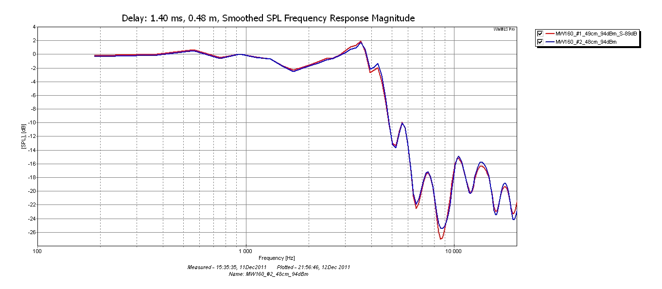 Кому интересно - АЧХ пары на оси, снятая в стандартном щите при звуковом давлении 94дБ/1м. Расстояние до микрофона - 0,5м. Окно 1/2 HannCos, сглаживание 1/12 октавы.