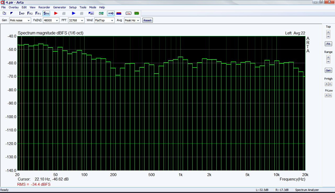 Включено все . Кружочки 1,2,3,4-дефектные участки , исправлению практически не подлежат , ну почти ... Тут есть маленькие хитрости , в точке прослушивания уровень отраженных и уровень прямого сигналов часто сопоставимы по уровню ( к счастью в очень узких участках спектра ) , поэтому можно выставить относительную задержку между СЧ и ВЧ , а так же частоты срезов и порядки фильтров , просто придвинув микрофон на расстояние 20-30 см до соответствующих излучателей . Однако пользоваться этим не всегда возможно , к примеру , когда уровень отраженного сигнала от левого стекла равен уровню прямого сигнала от правого СЧ (множественная локализация ЦО , или ЦО расфокусирован и тянет влево ), т. е. динамик направлен на середину левого стекла . Картинка ниже , те же области на ГВЗ. Короче еще некоторое время морочим голову с настройками . Картинка фазы почти не изменилась по сравнению с первой в этой серии (сохранять уже поленился), немного меньше истерики в кружочке номер три . Элла Фиджеральд по центру , за стеклом , саб назад не тянет , приличная атака . АЧХ на картинке ниже . ПС. Спектралаб рулит при настройке в реальном времени , АРТА хороша для анализа уже настроенного . |